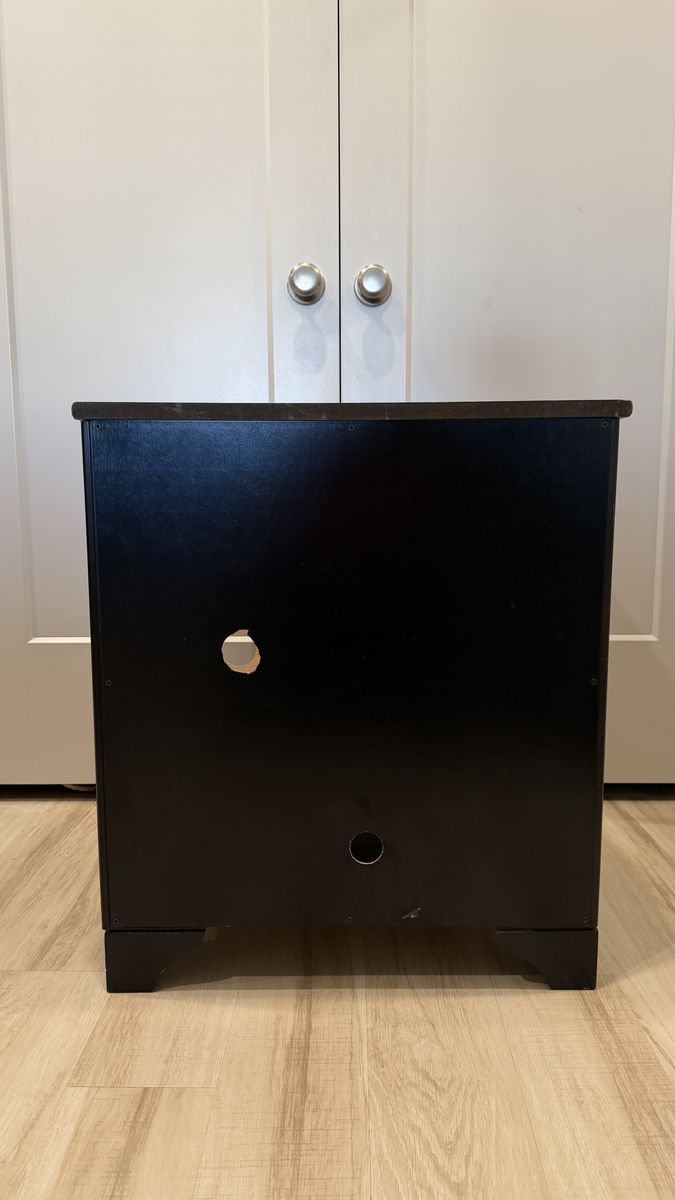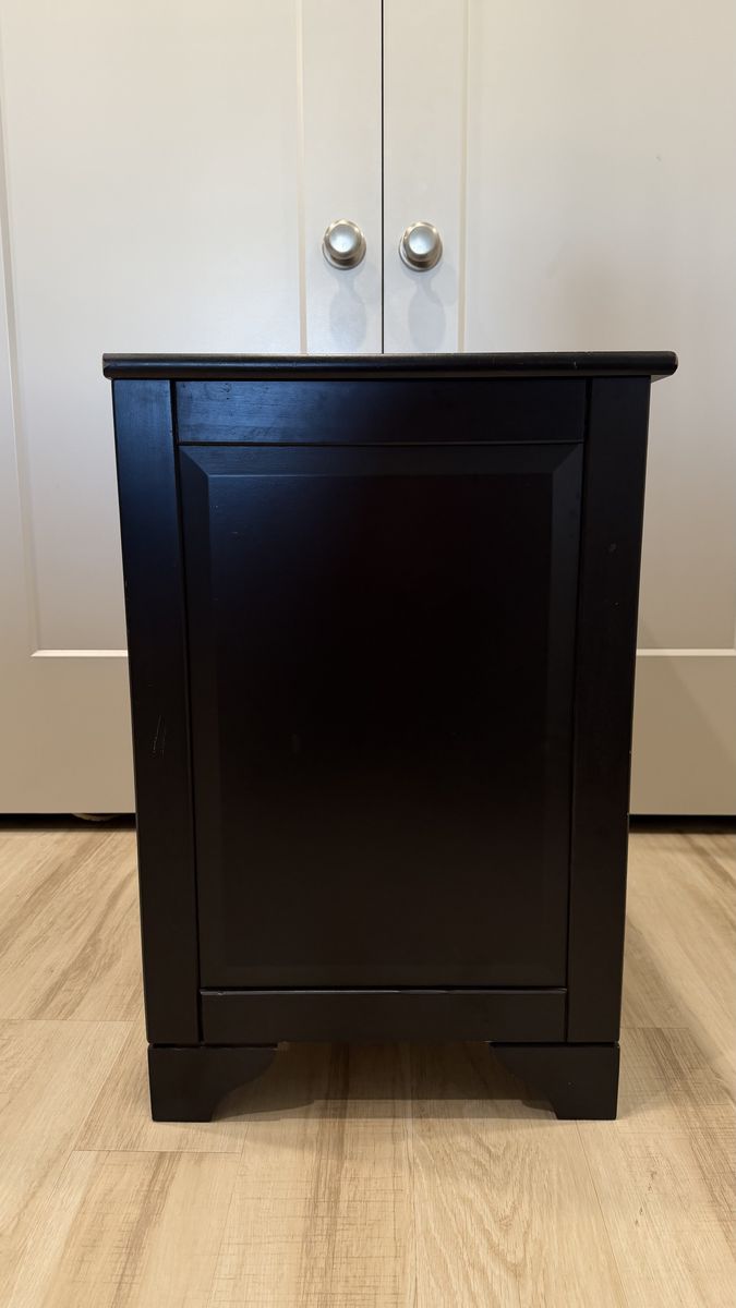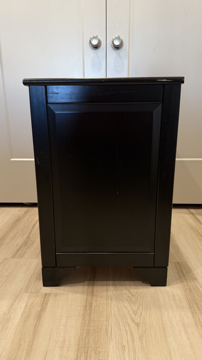 VenmoBlack night stand with drawer and 3-position adjustable shelf.