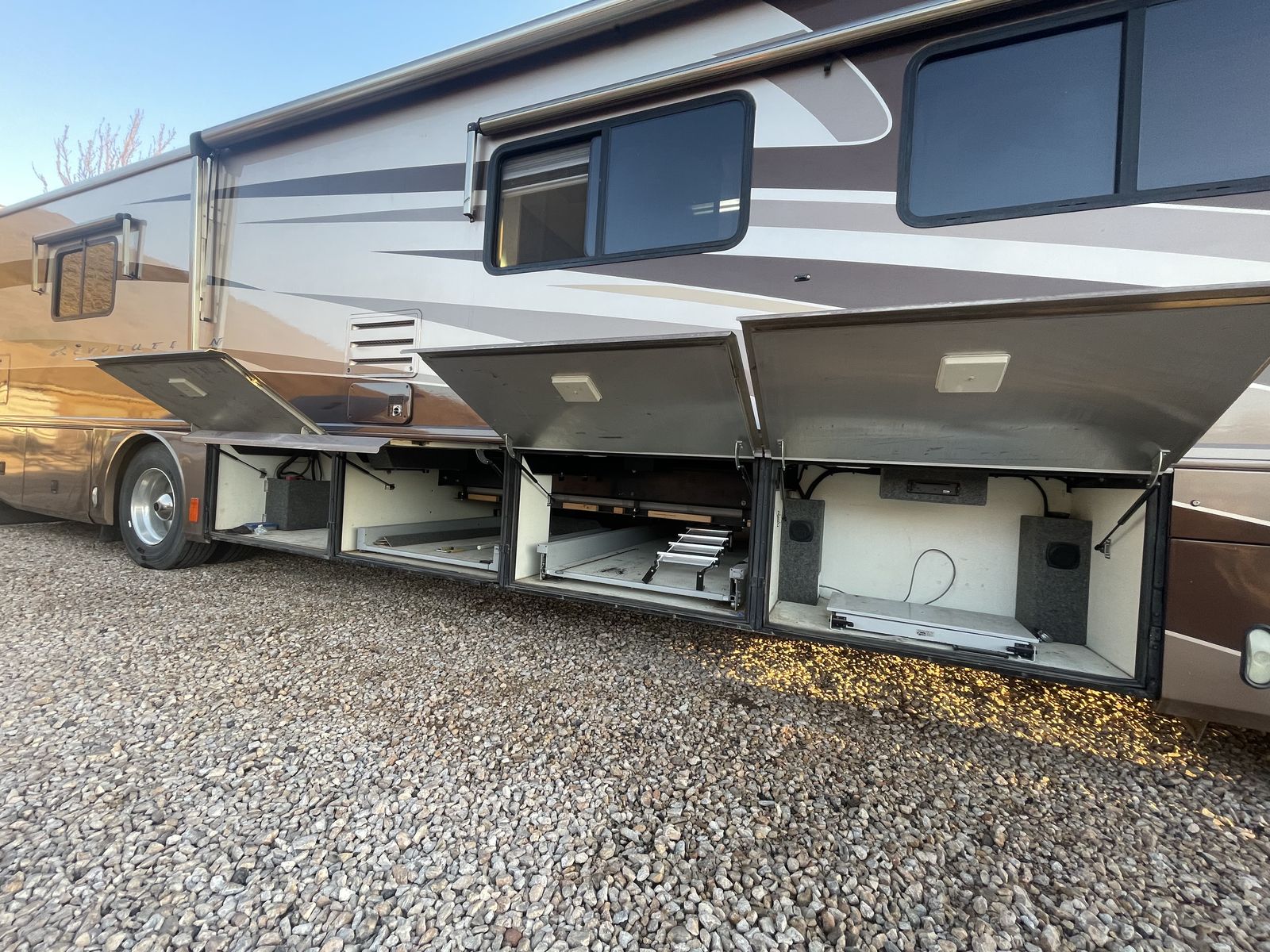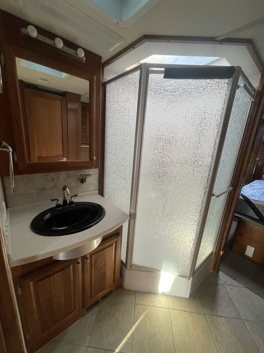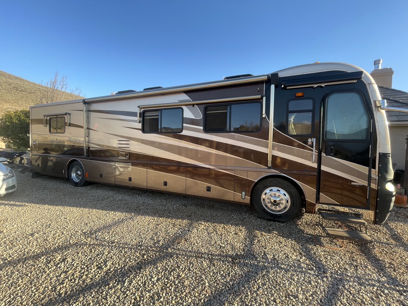 This 2003 Fleetwood Revolution 40C with 59,312 miles is a 40-foot luxury diesel pusher built on a Freightliner chassis with a 350HP Cummins ISC engine and Allison 6-speed transmission. It features two slide-outs, sleeps up to 6, and offers high-end amenities like a rear island queen bedroom and 10,000 lb towing capacity.