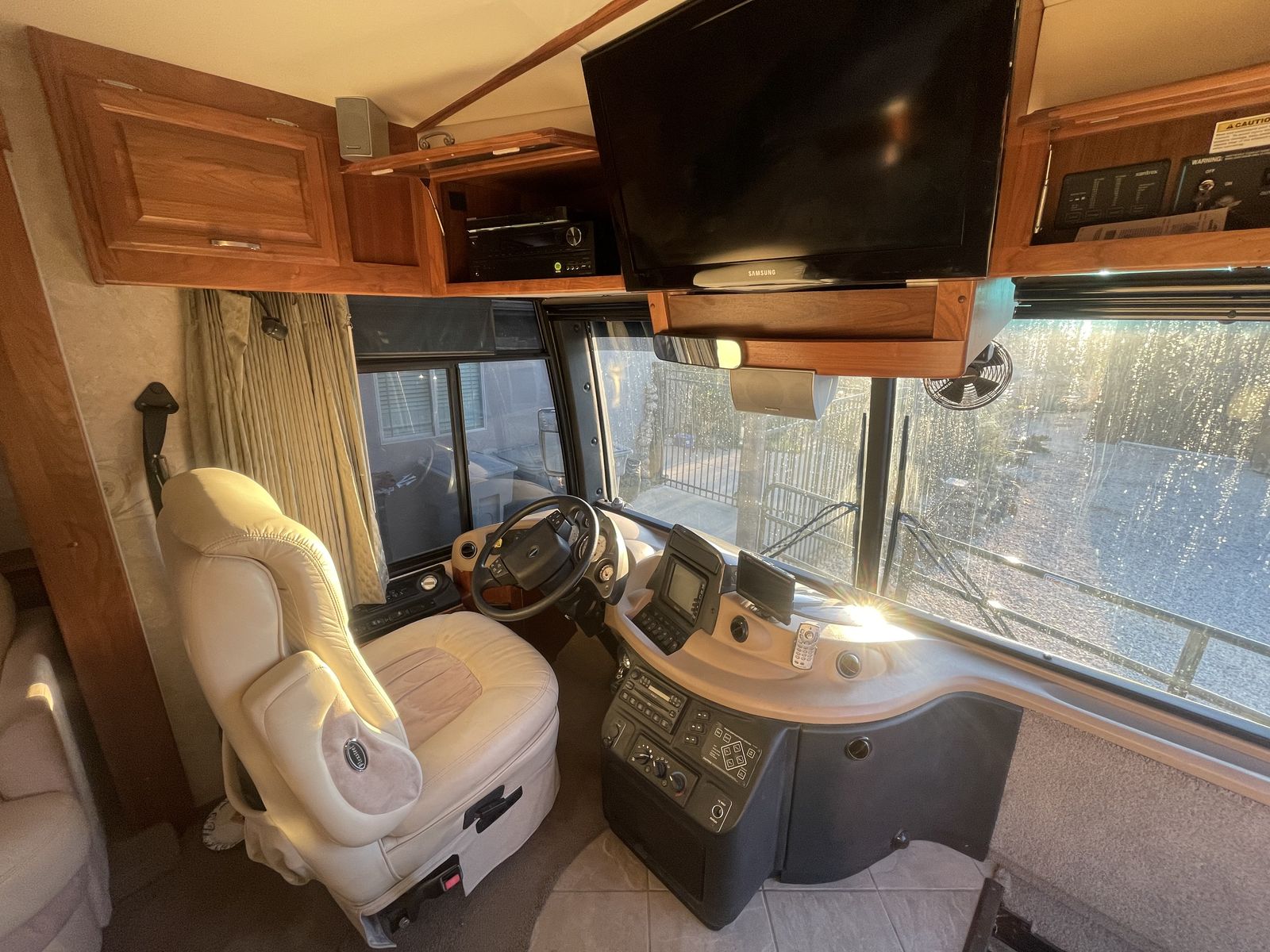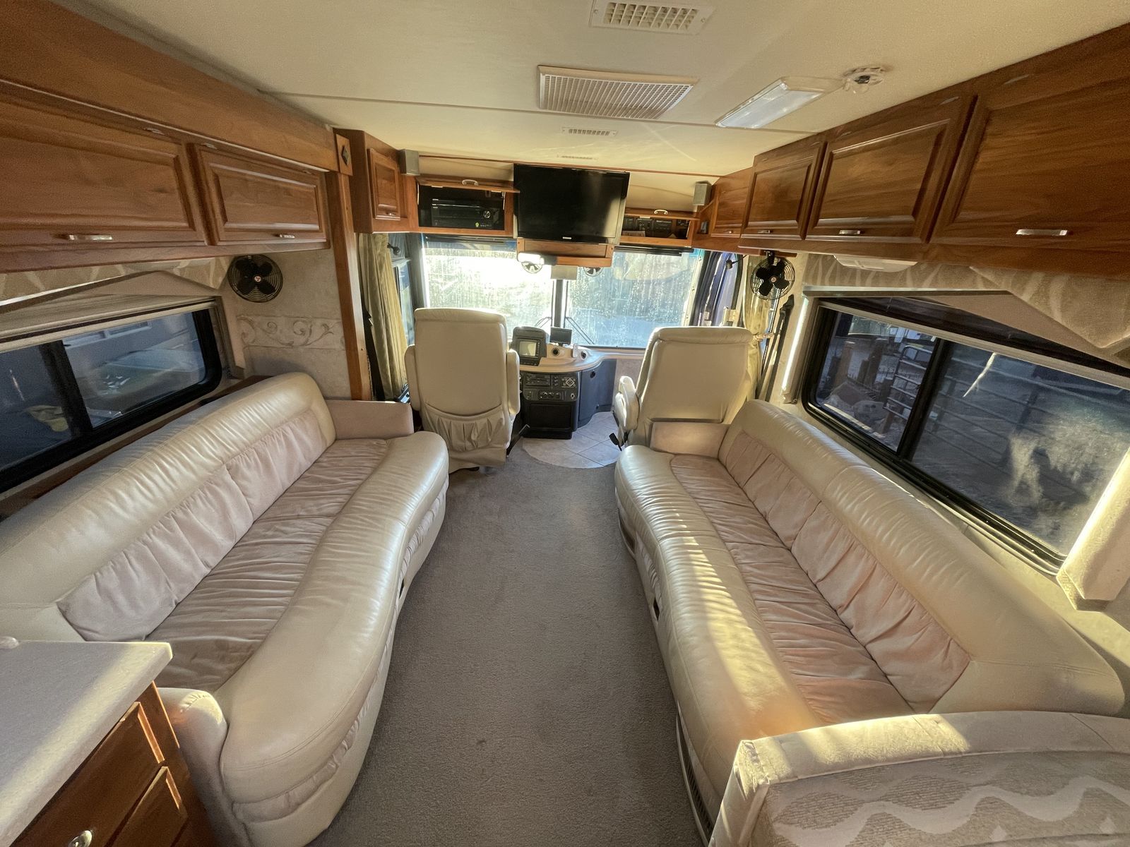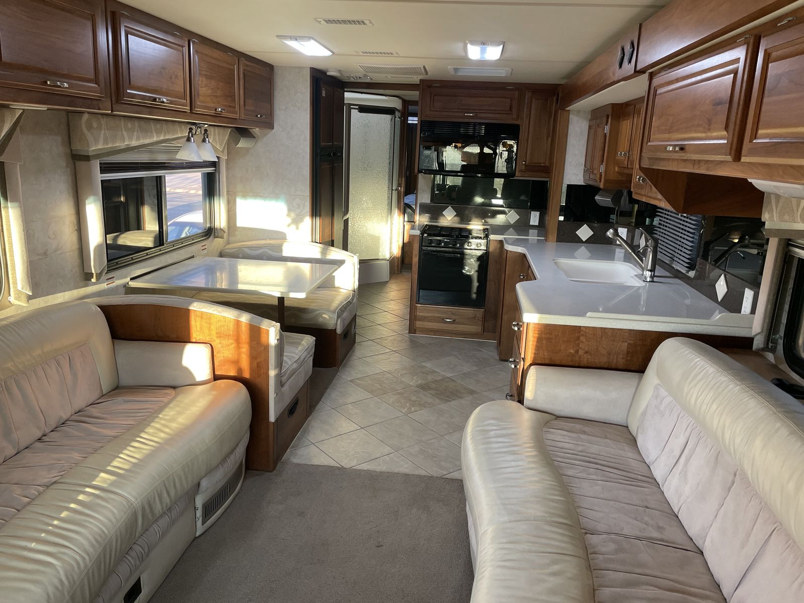 This 2003 Fleetwood Revolution 40C with 59,312 miles is a 40-foot luxury diesel pusher built on a Freightliner chassis with a 350HP Cummins ISC engine and Allison 6-speed transmission. It features two slide-outs, sleeps up to 6, and offers high-end amenities like a rear island queen bedroom and 10,000 lb towing capacity.