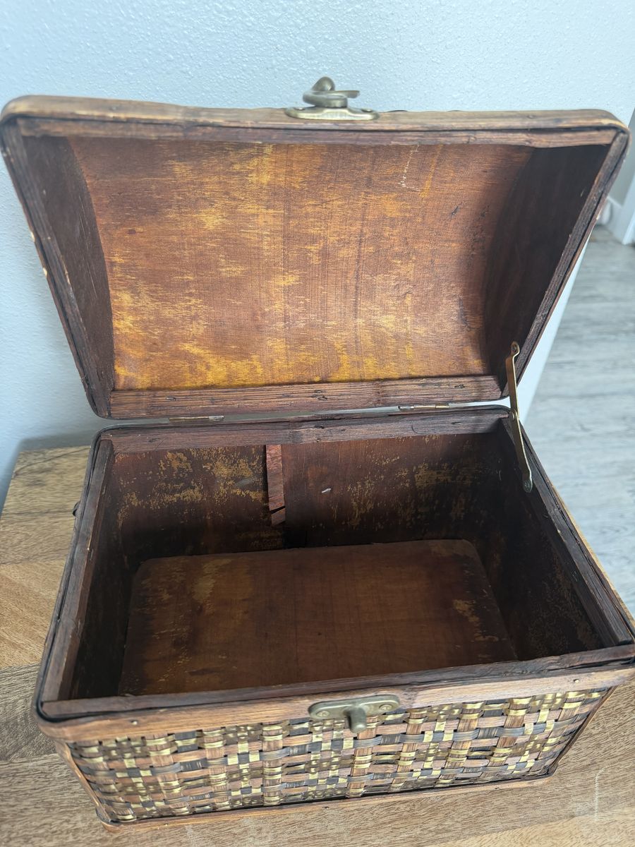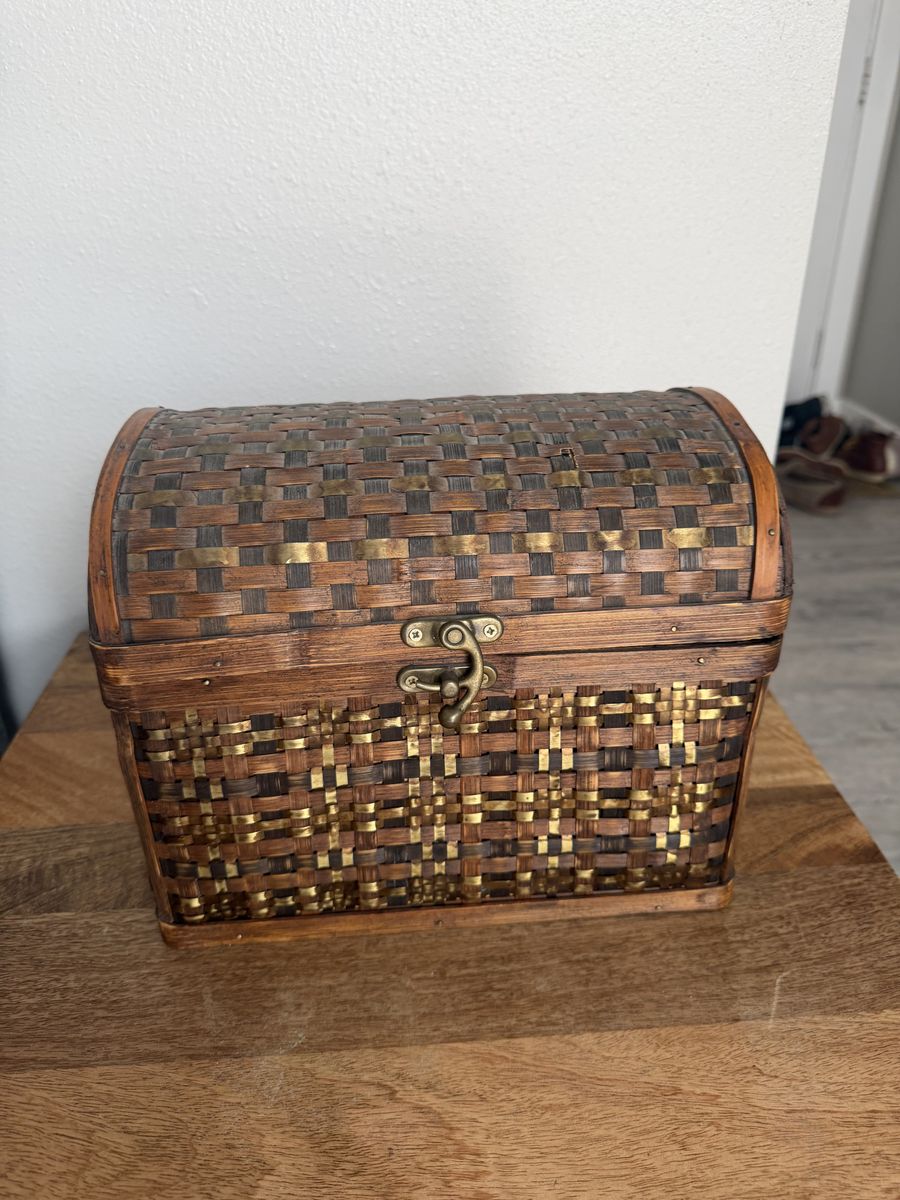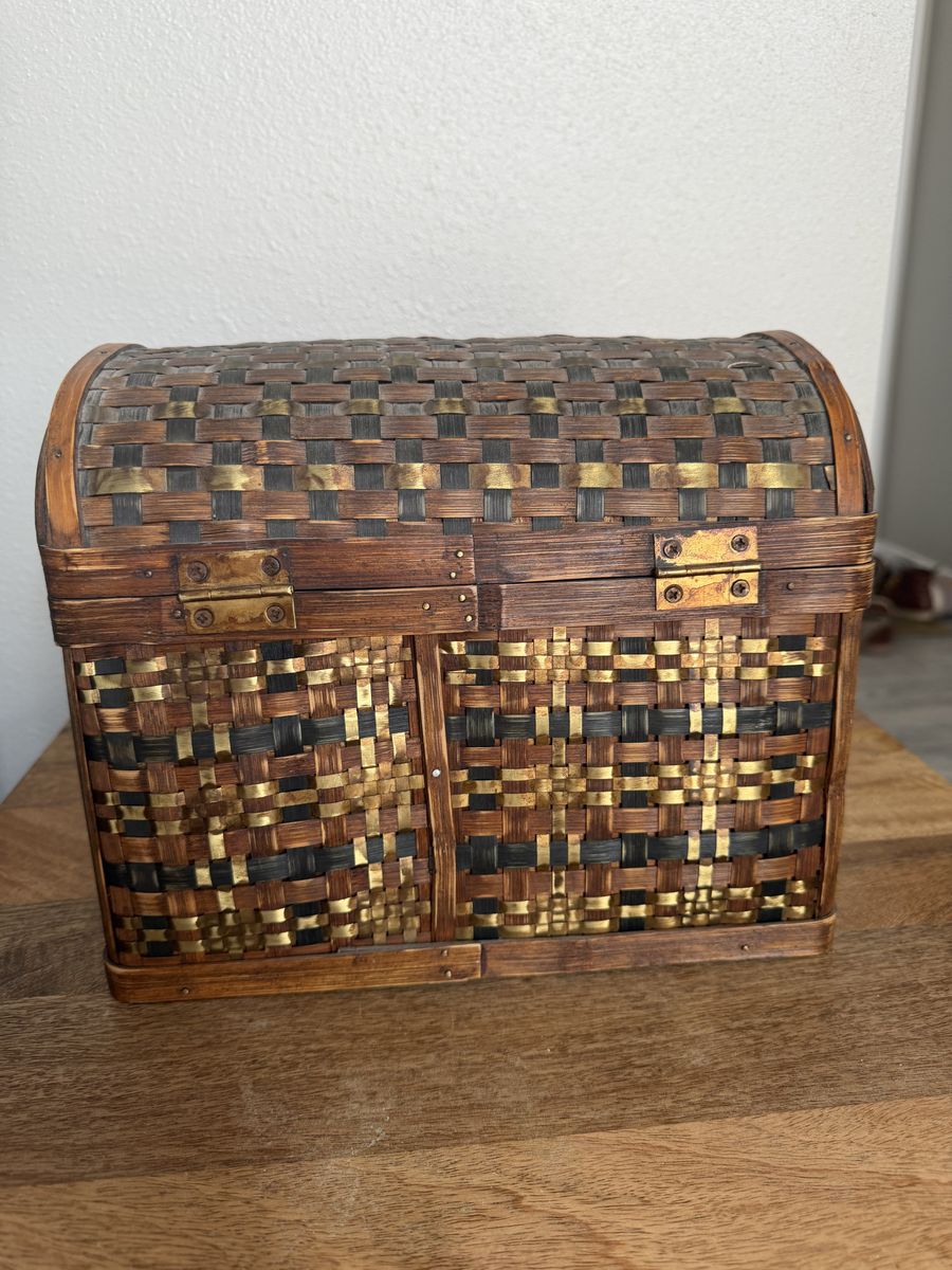 Beautiful woven wood treasure chest with brass-tone hardware. This piece has a great Global Explorer or Boho look—perfect for storing photos, craft supplies, or using as a decorative memory box. • Style: Woven slat design with metallic gold/brass accents. • Condition: Good used condition. Minor wear on the bottom edges (see photos), but sturdy and clean.