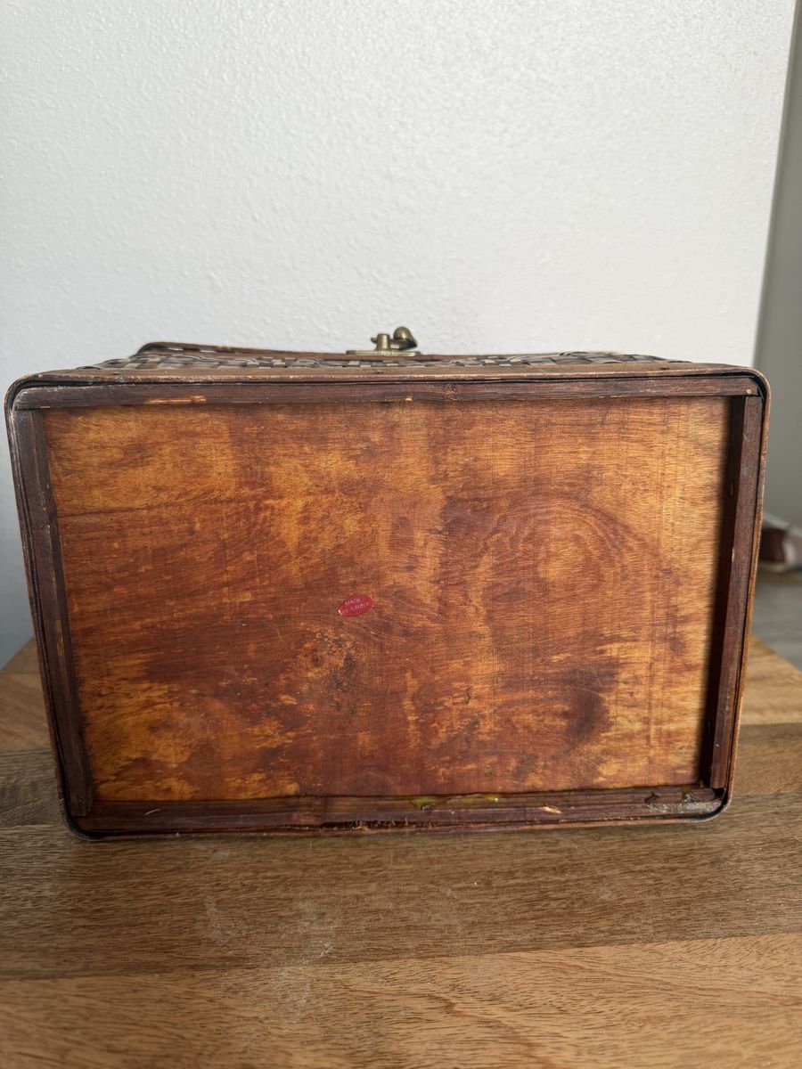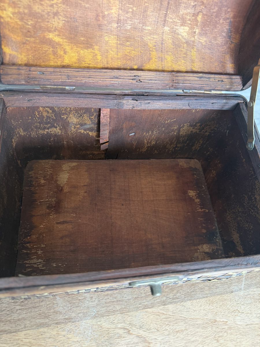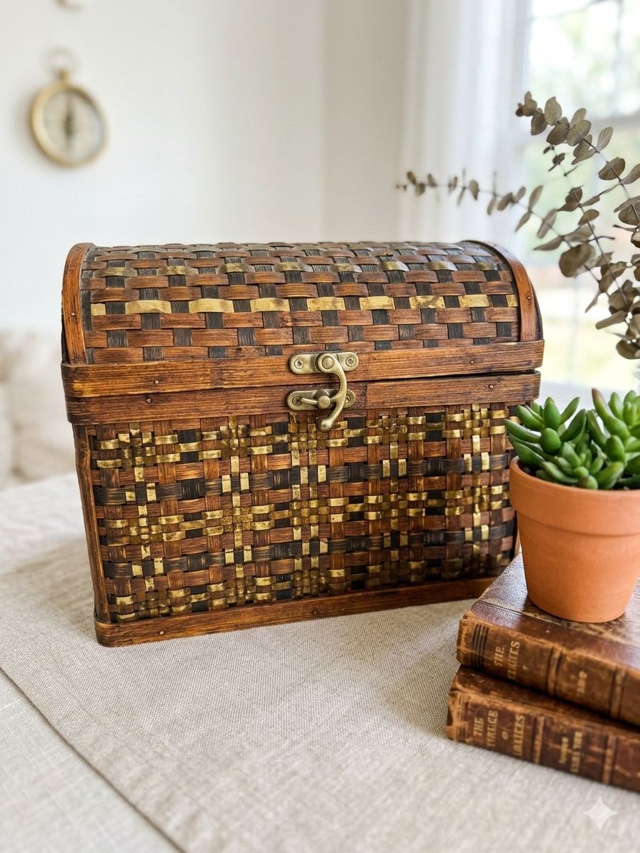 Beautiful woven wood treasure chest with brass-tone hardware. This piece has a great Global Explorer or Boho look—perfect for storing photos, craft supplies, or using as a decorative memory box. • Style: Woven slat design with metallic gold/brass accents. • Condition: Good used condition. Minor wear on the bottom edges (see photos), but sturdy and clean.