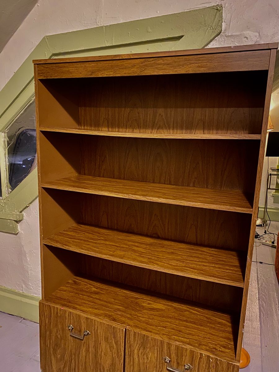 VenmoSolid wooden bookshelf with beautiful wood grain and a mid-century style look. Perfect for books, decor, office storage, or garage organization.