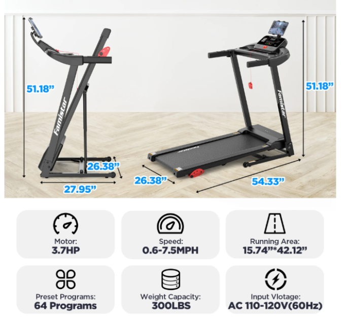 VenmoNew in box. Famistar T70 treadmill. Features 64 preset workouts, 3 user-defined modes, 3 countdown options, and a FAT program for BMI detection, supporting a 300lb capacity.