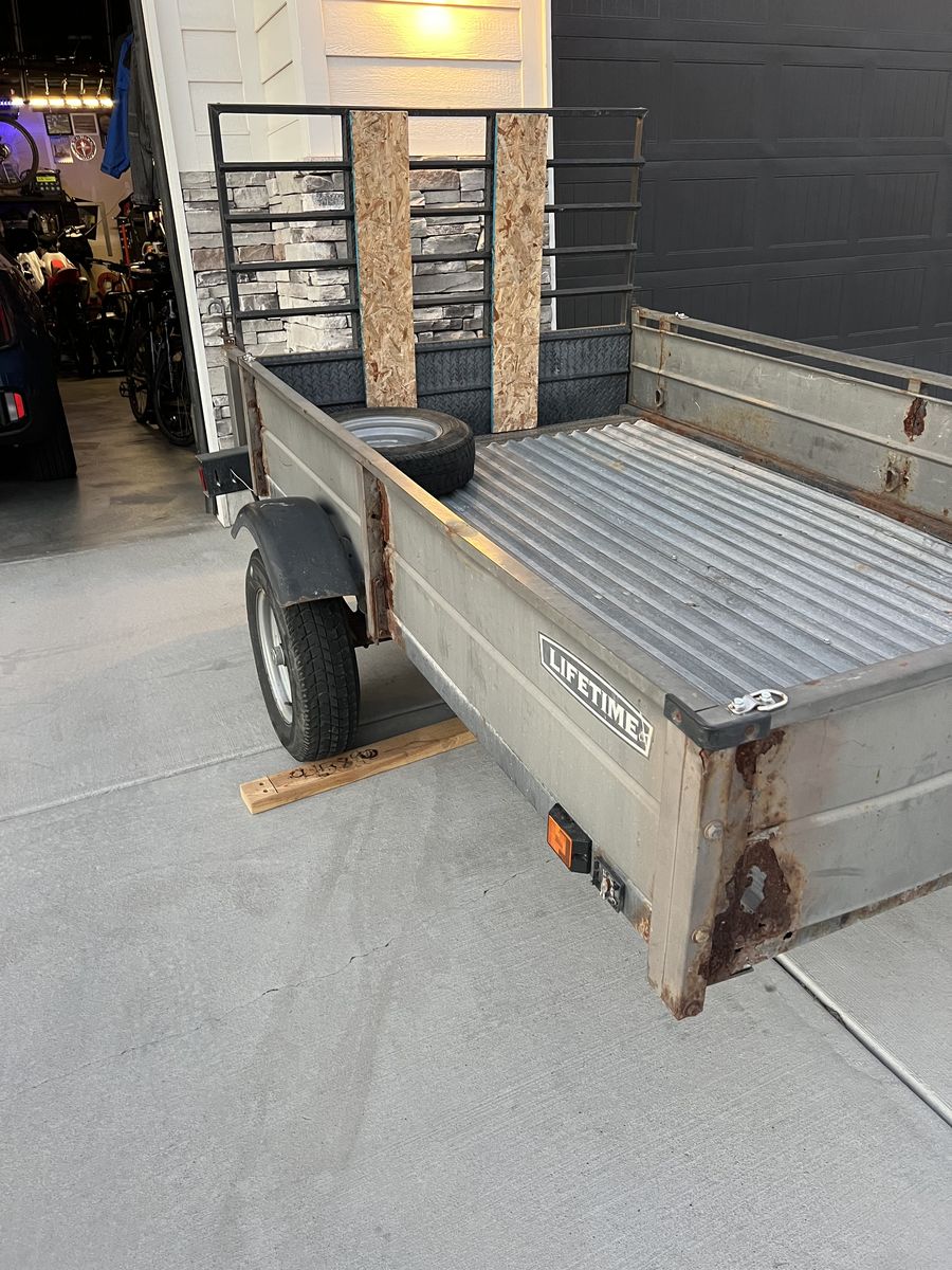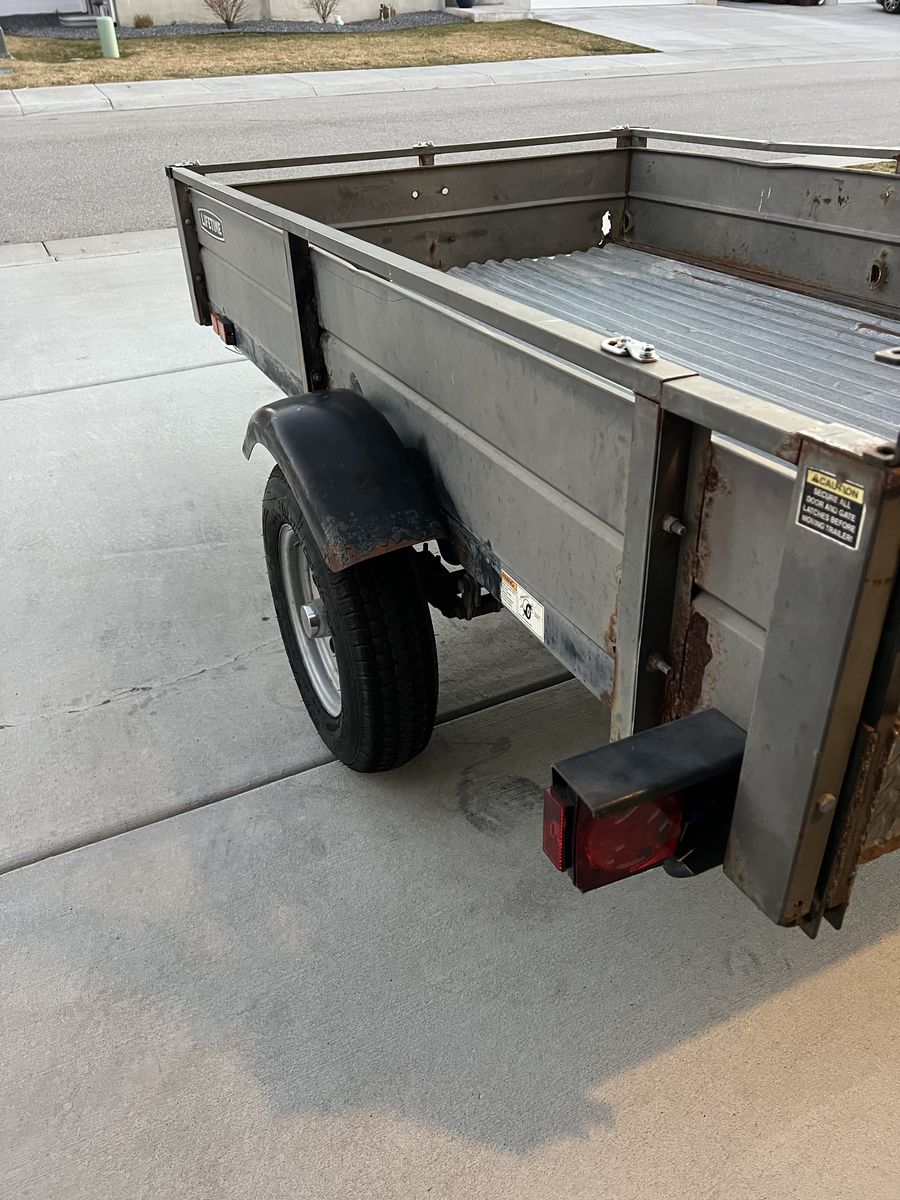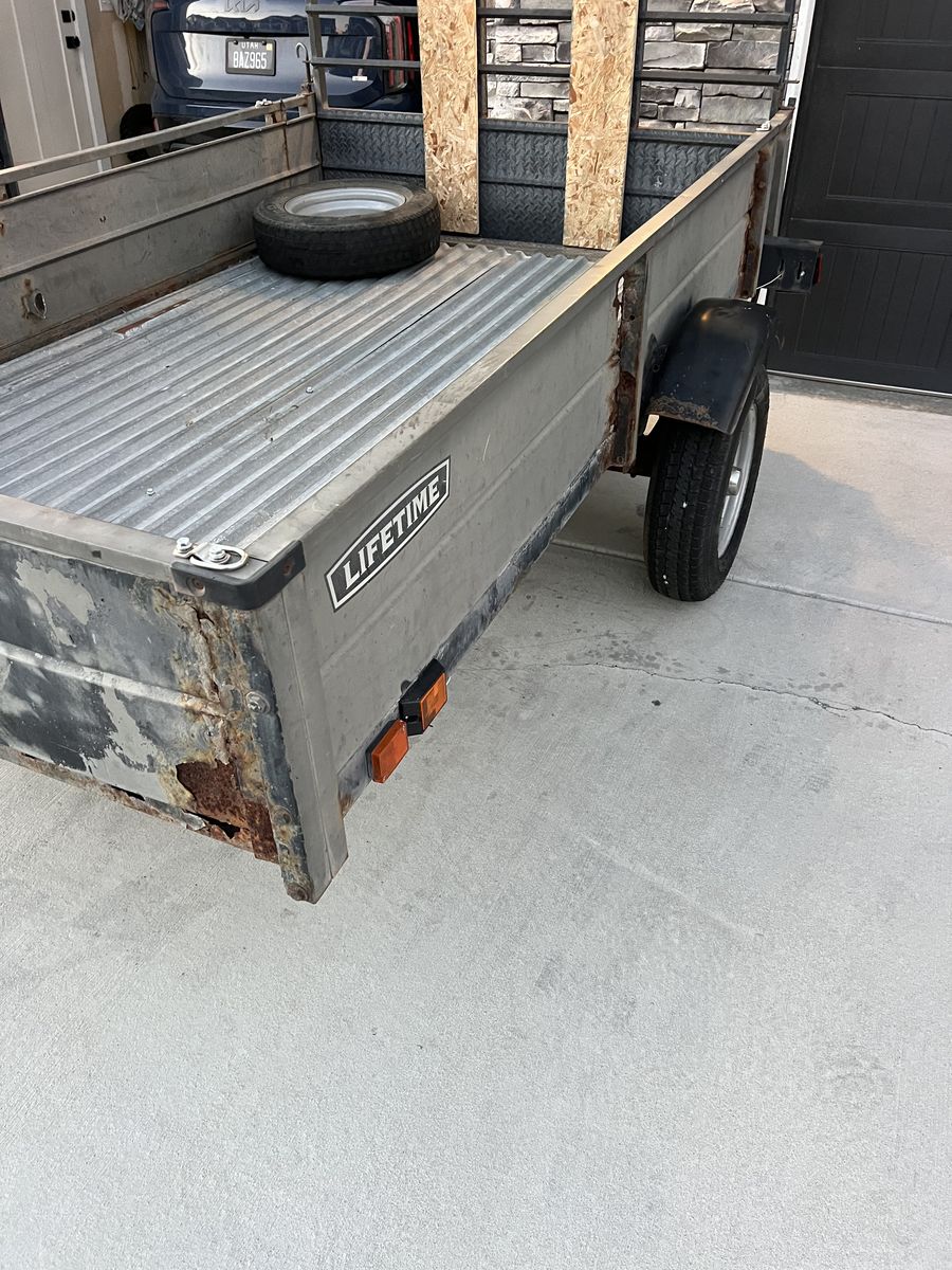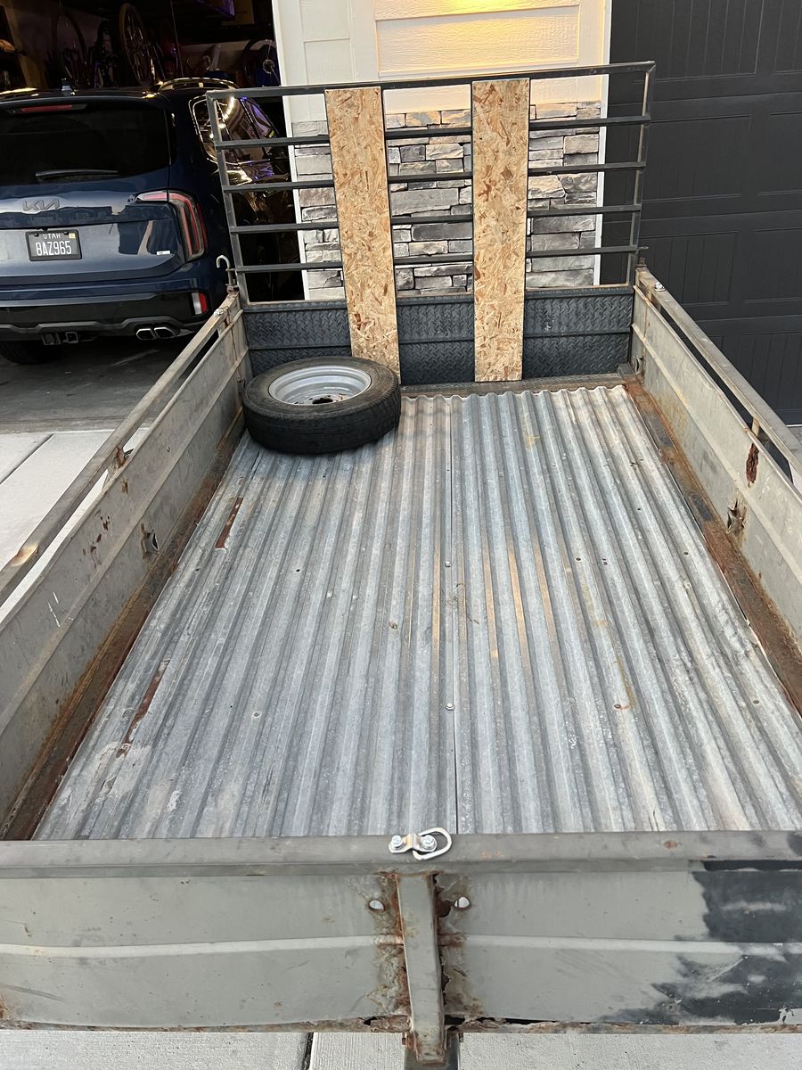 ApplePayTilt bed trailer. 89 inches inside length. 59 1/2 inside width. Over all length 11 feet 7 inches. This is too small for my needs. Grounded all wiring. Added tie down rings to top rail. Added a four flat extension due to wiring being to short. Packed wheel bearings with fresh grease. $400 firm.