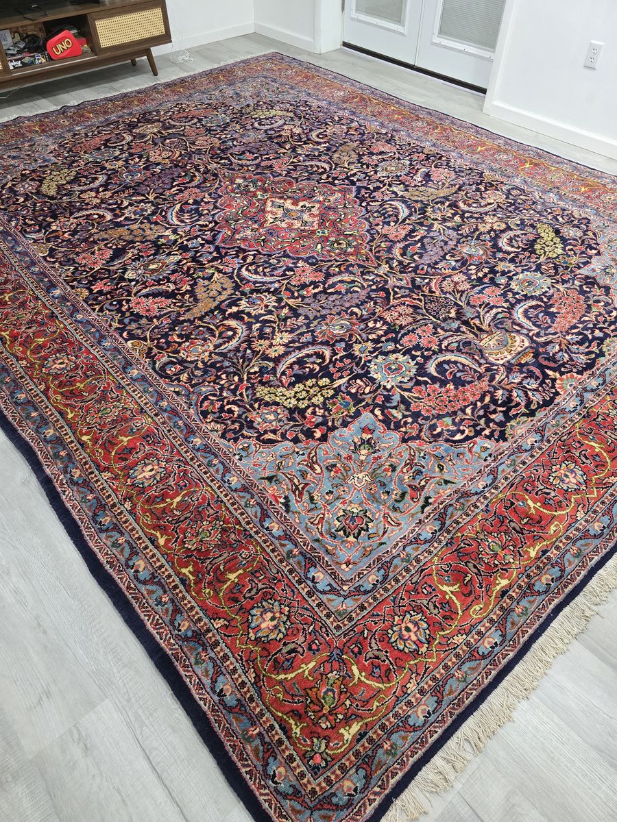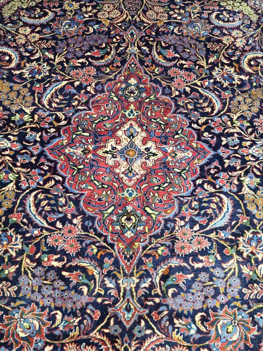 This is a magnificent hand‑knotted Persian Kashan rug . At its heart sits a rich medallion in deep reds and surrounding are elaborate floral designs in a lustrous navy background. The rug is framed by multiple borders, where complementary tones of sky blue, burnt orange, ivory, green, and gold create a refined and vibrant tapestry of color against the deeper-colored center. Every inch expresses dense and highly detailed character. Even in photos, you can see the beauty not only in design, but also craftsmanship.