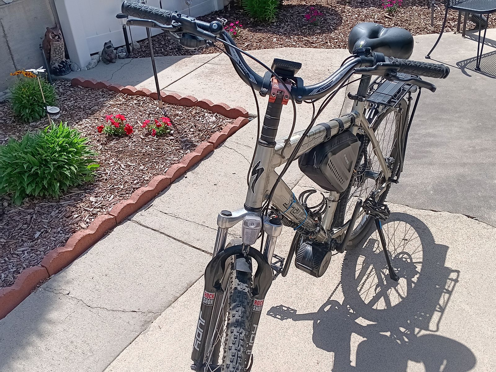 Specialized converted E-Bike. >New front tire>New rear brakes>hydraulic Brakes.New Chain>New cassette>New Mud guards>Tire Liners>BBS02 750W MTR 9speeds Bike has 8 speeds>caddence peddling>Haylong 52V 20Amphr Battery>About 60 miles depending on weight and hills and gravel.Comes with rear heavyduty rear rack & bell. I updated everything so It will last the new buyer a long time>caddence peddling.