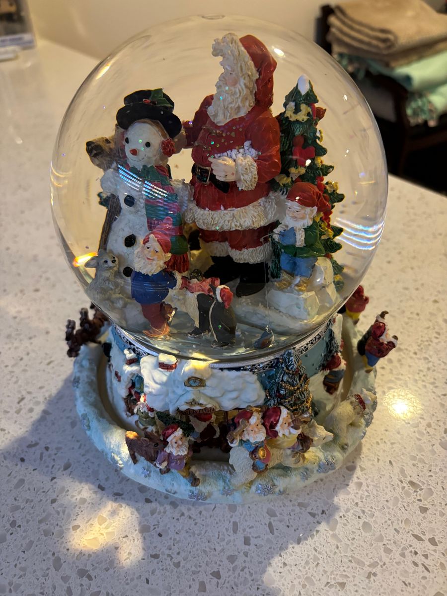 VenmoLarge Christmas Snow Globe. Very detailed and well made. Base rotates around as music plays. Approximately 7 Inches tall and 7 inches in diameter.