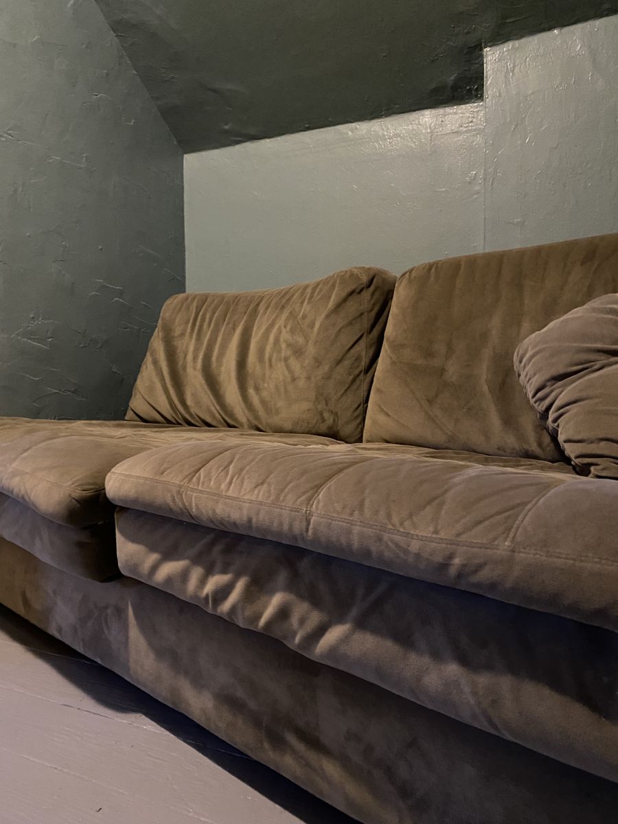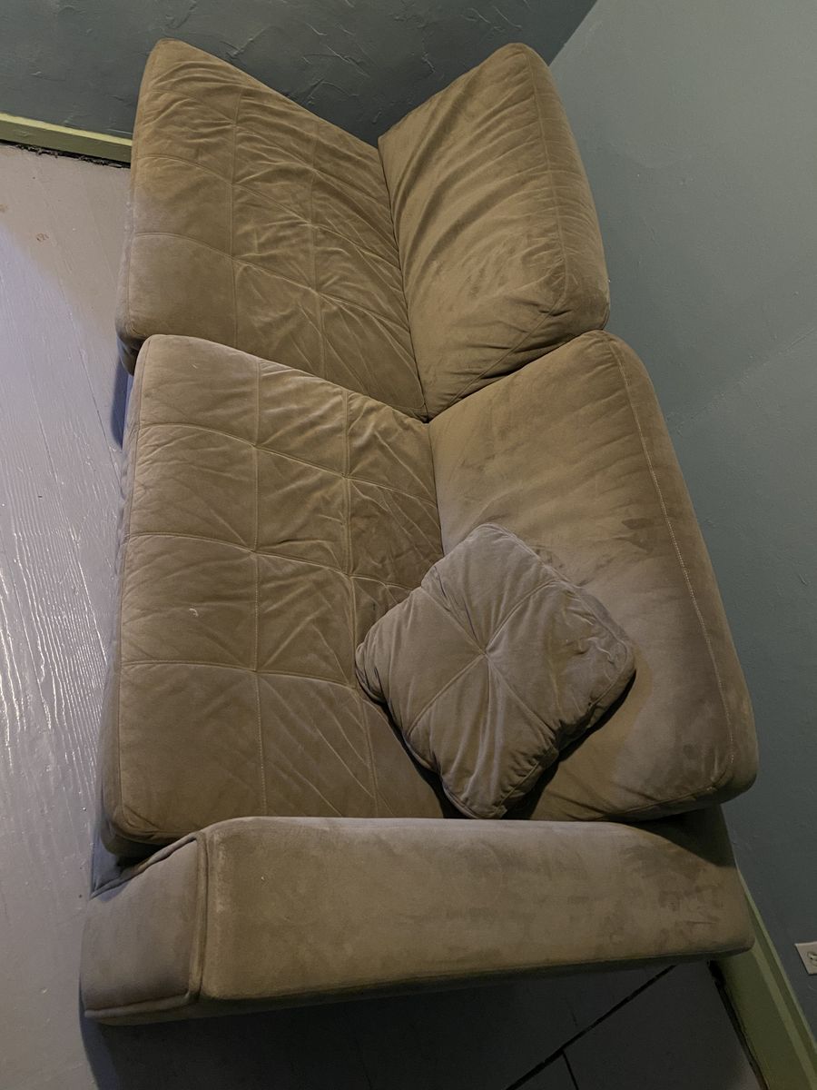 Full sectional with chaise configuration Tufted microfiber upholstery — soft, durable, and easy to clean Low-profile design with deep, supportive seating Solid, heavy frame — built to last Matching throw pillow included Good condition — well-loved, not abused