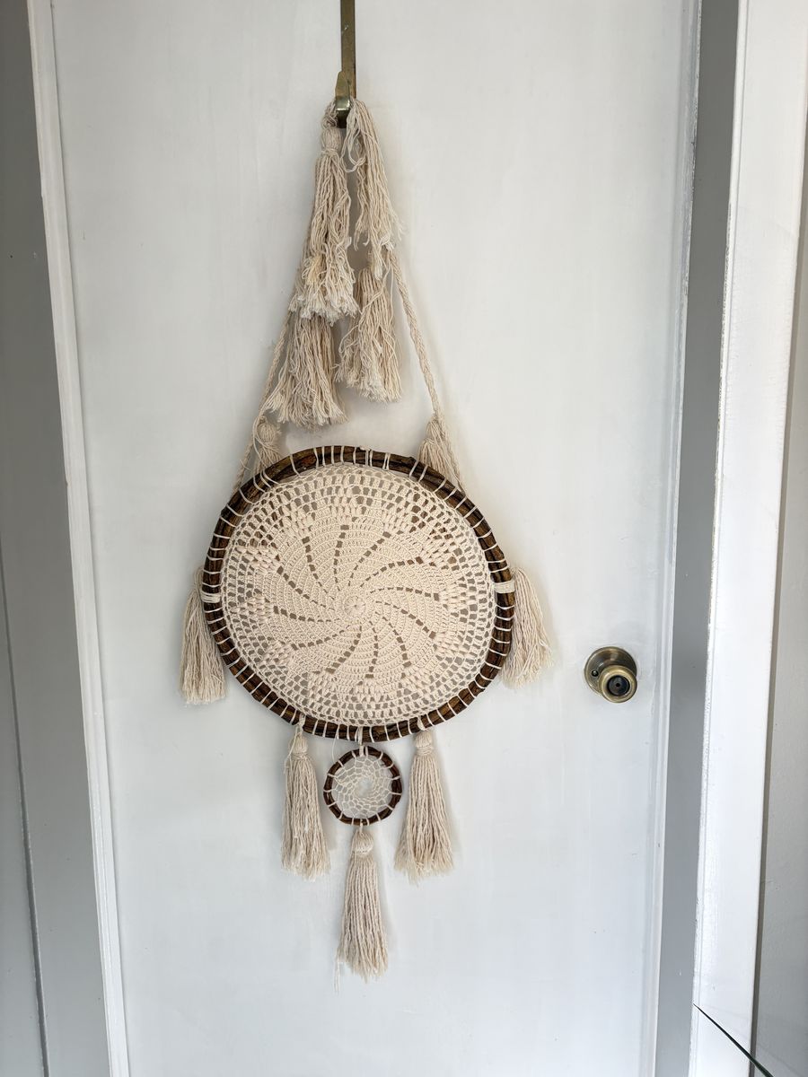 Handmade dream catcher. Cream and natural wood. 43x18 across.