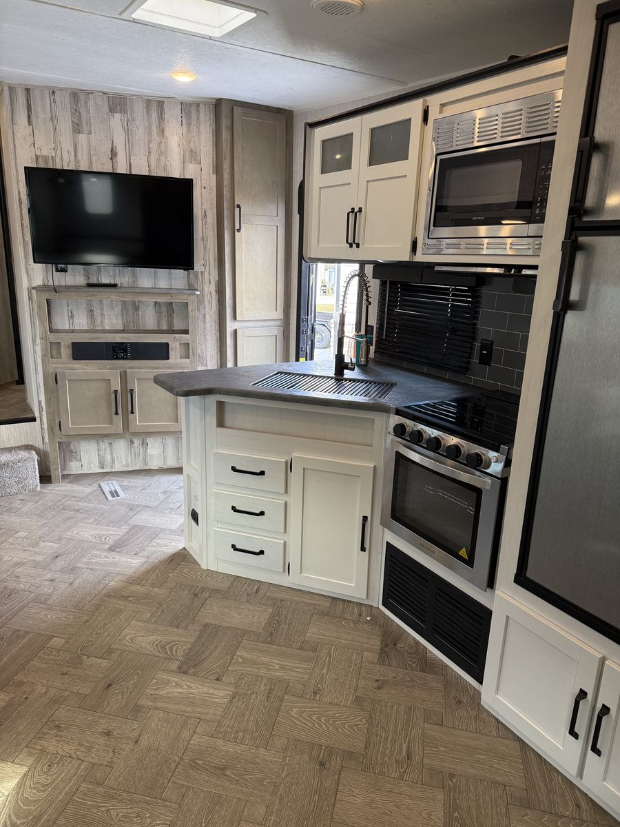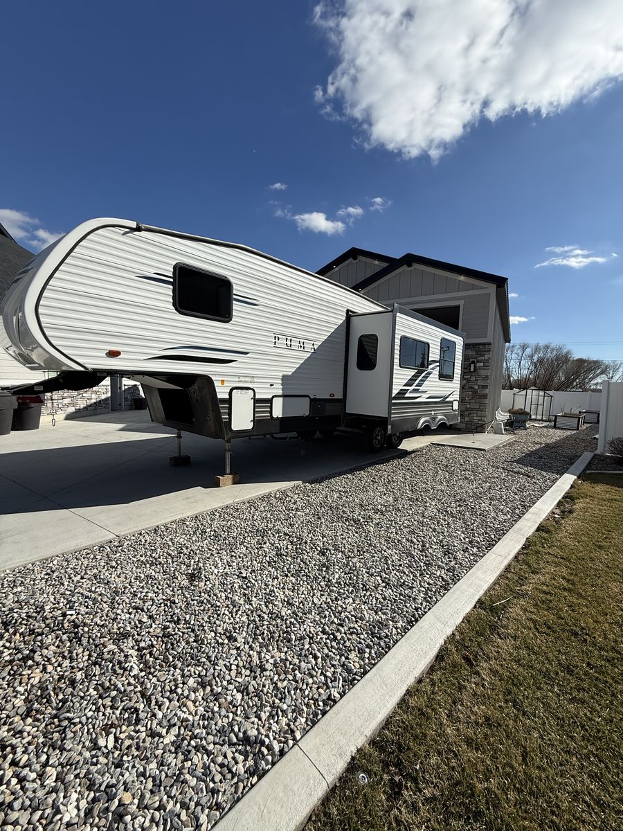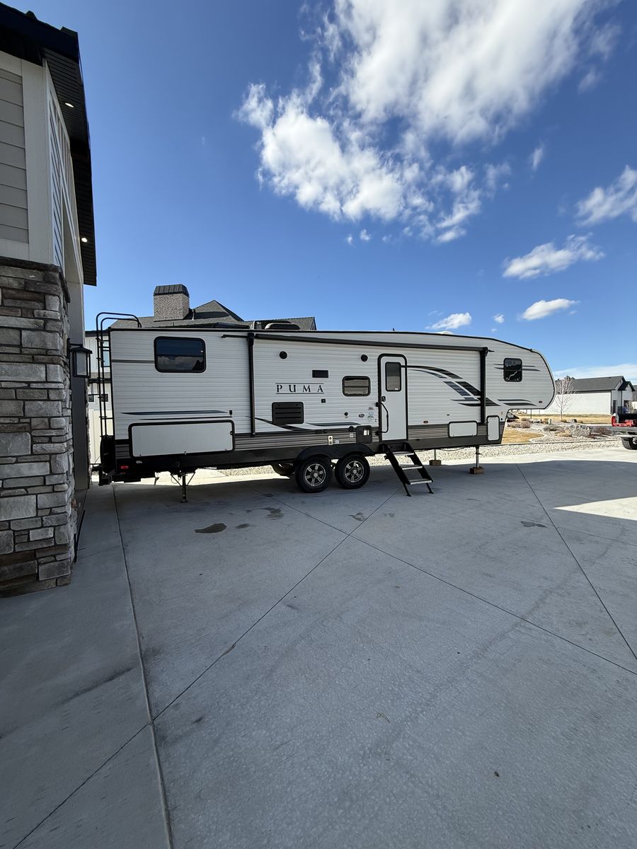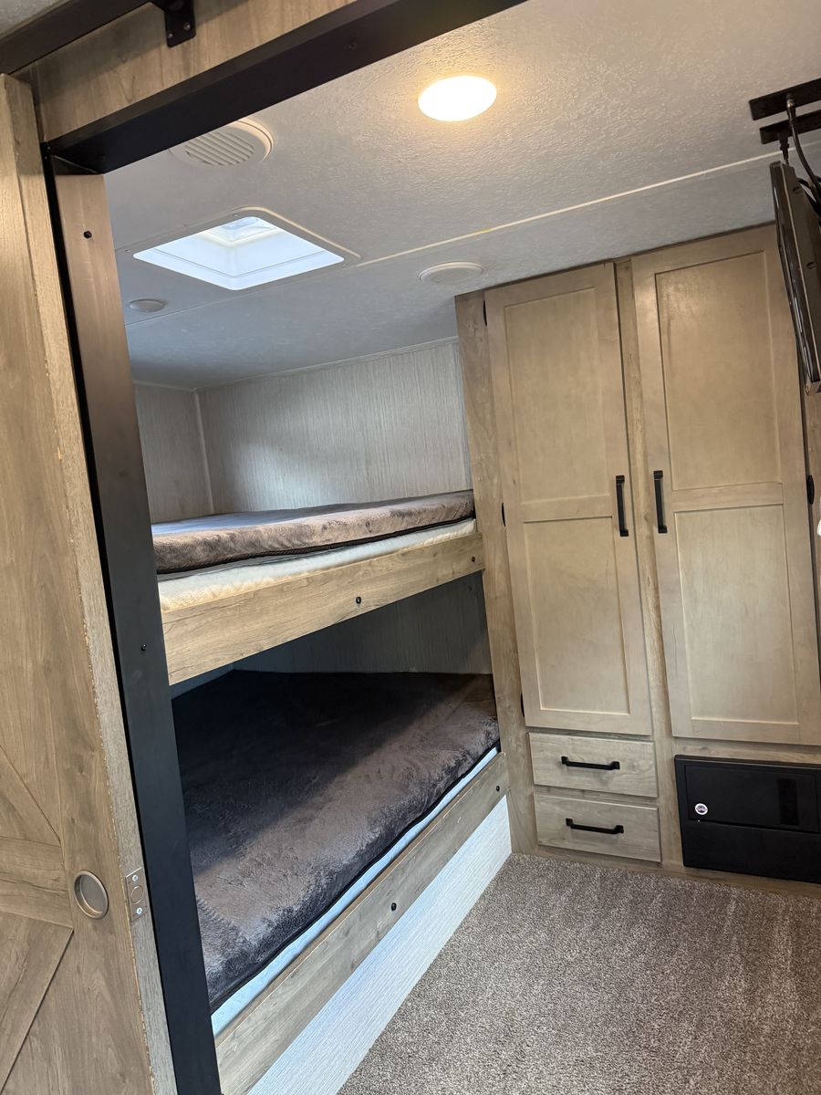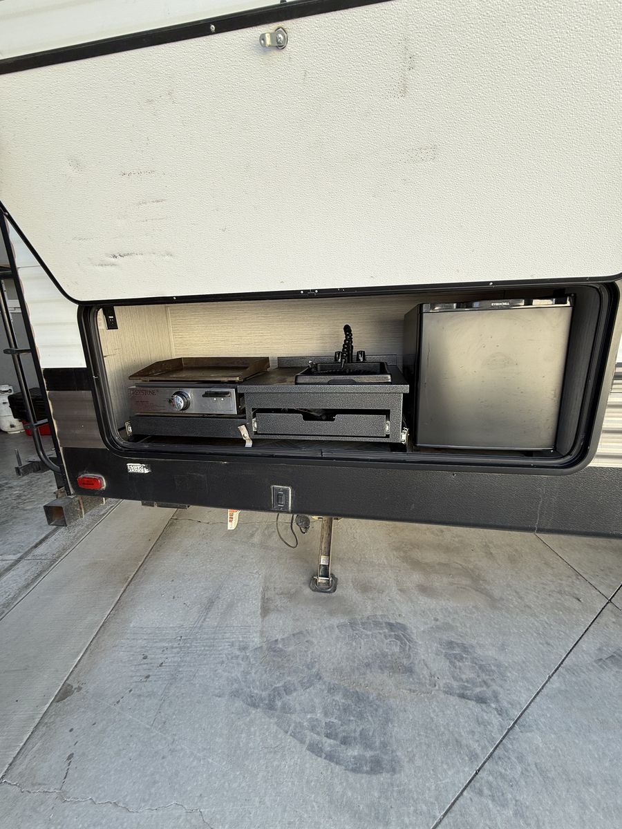 Fifth-wheel This has been a great trailer, have just out-grown it. 34’ total overall length 2 propane tanks 2 12-volt batteries Outdoor kitchen Outdoor shower 3 TV’s Bunks- full size beds Portable solar panel Hitch on back Come take a look!