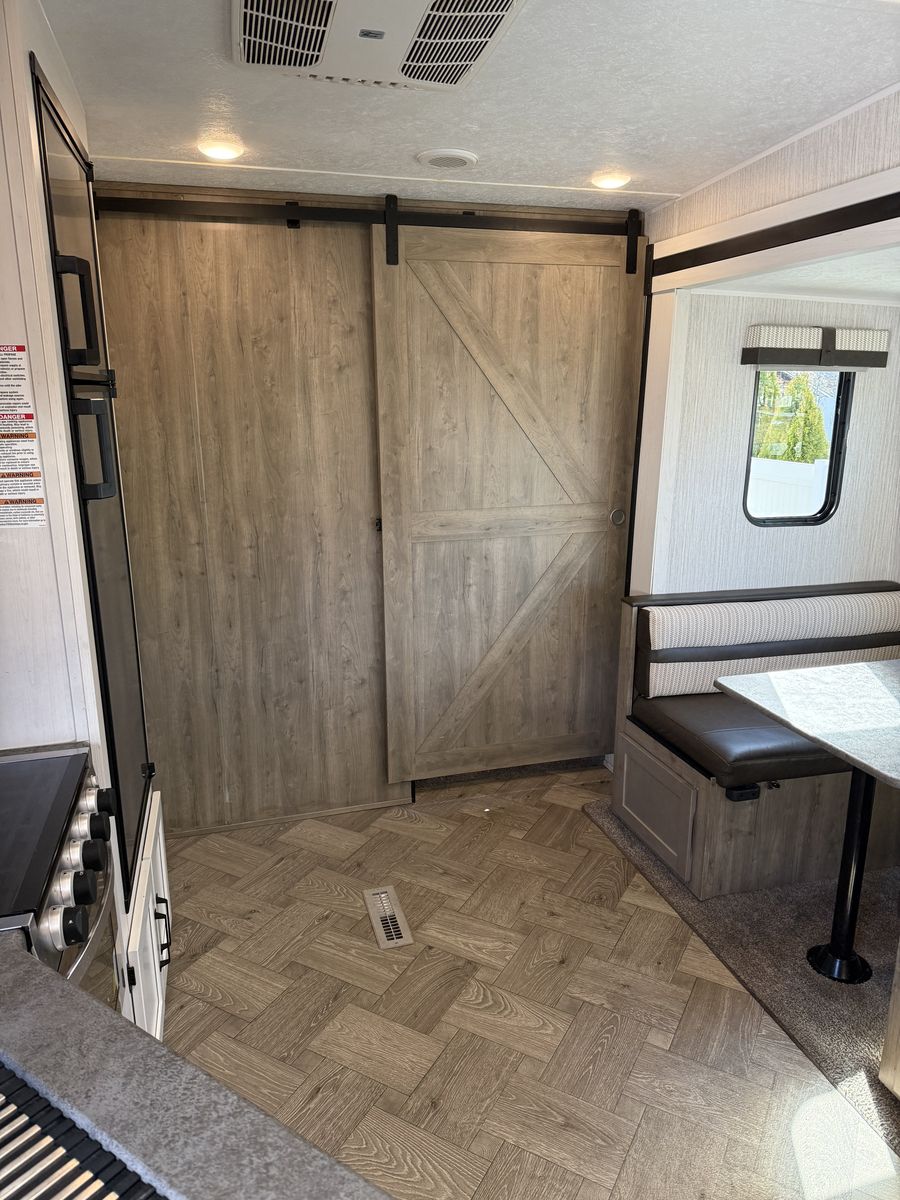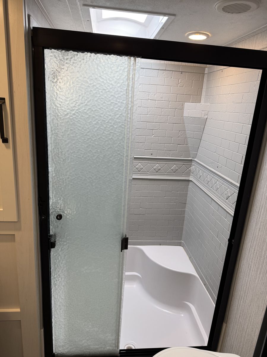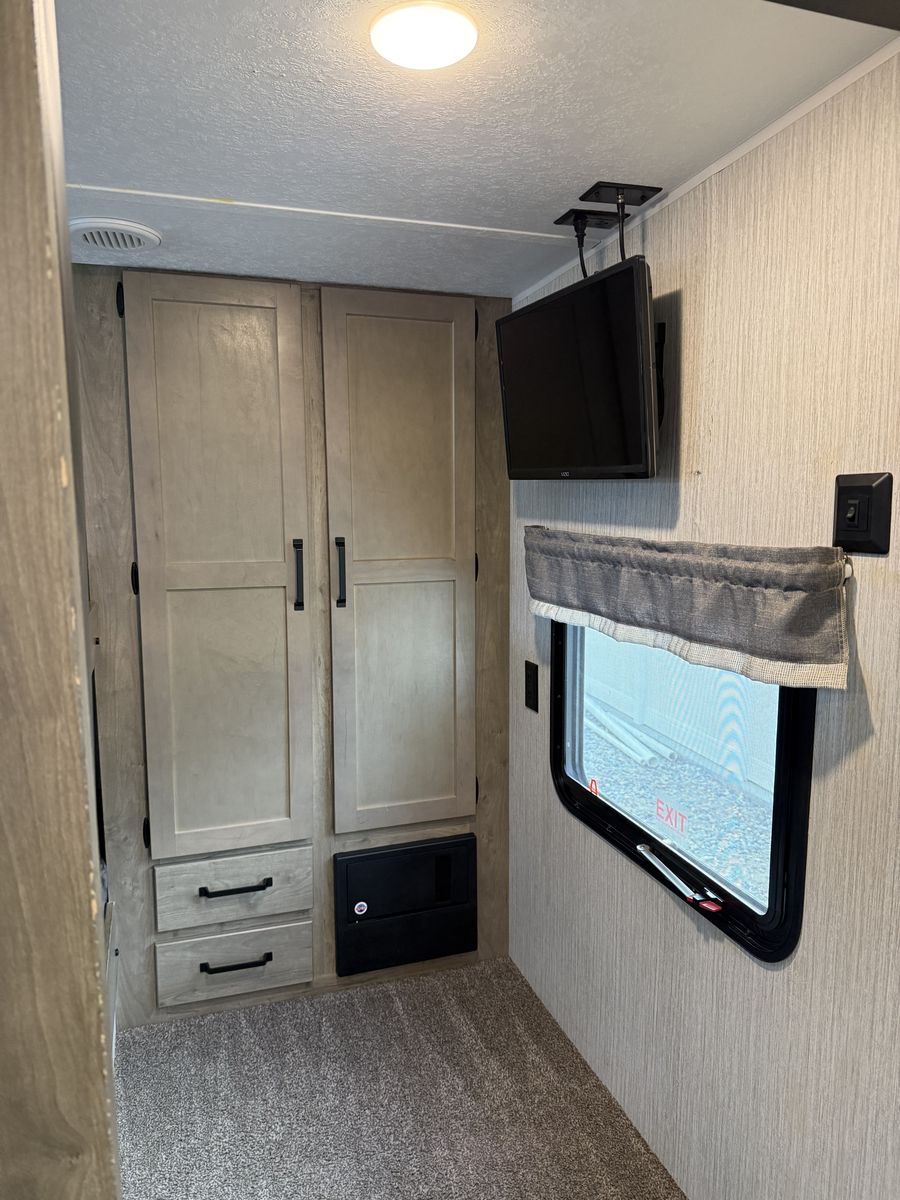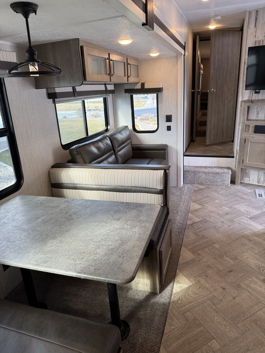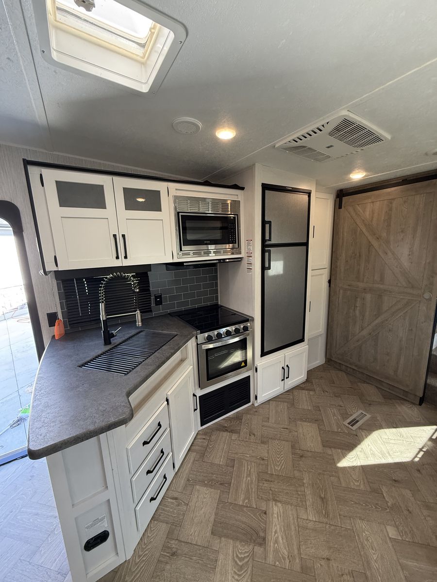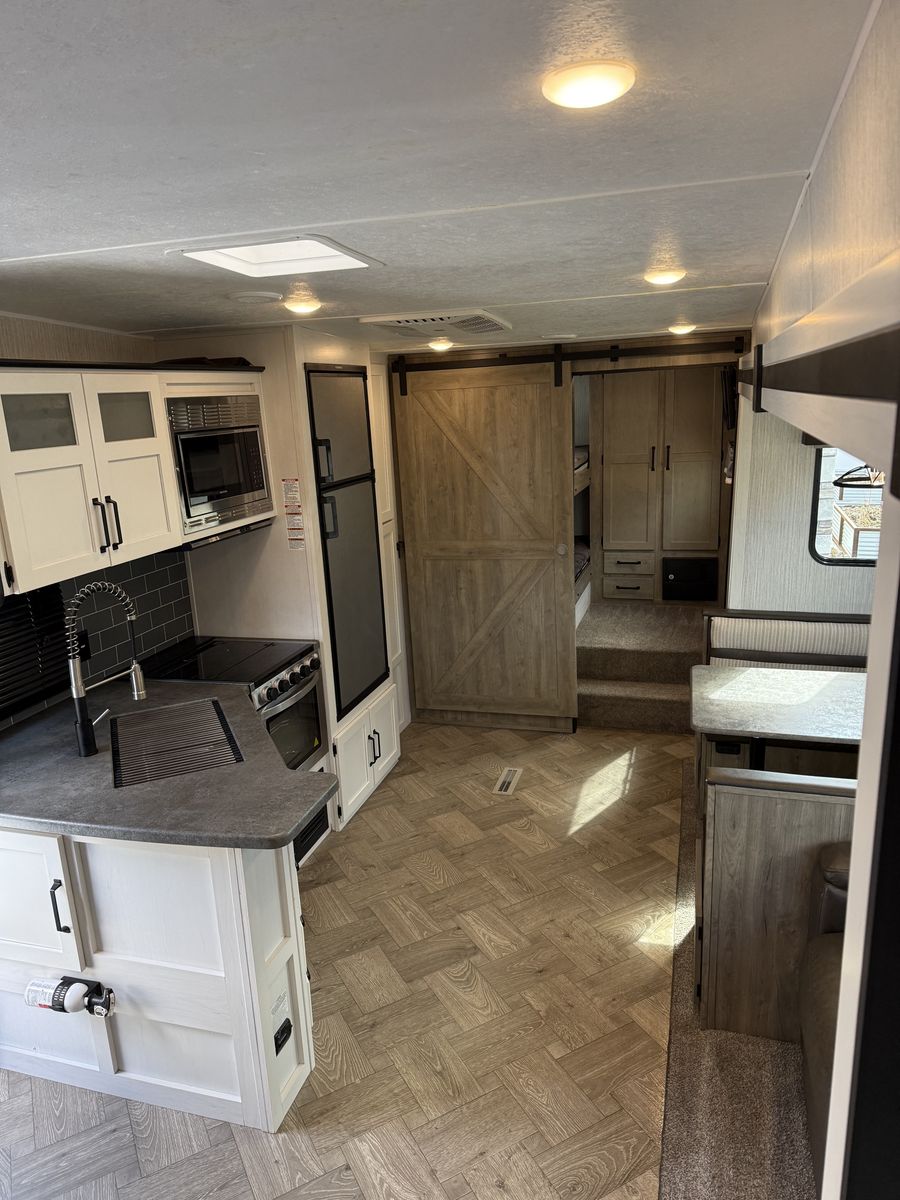 Fifth-wheel This has been a great trailer, have just out-grown it. 34’ total overall length 2 propane tanks 2 12-volt batteries Outdoor kitchen Outdoor shower 3 TV’s Bunks- full size beds Portable solar panel Hitch on back Come take a look!