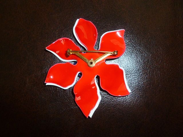 VenmoThis is stunning and very pretty. The colors are red, white and navy blue. The center is dark navy blue with what looks like coral. Is the only way I can describe it. The white petals are accented by a second layer of petals that are painted red. This is a painted metal pin. The colors are vibrant. It measures 3 inches across. This is in excellent condition. Pictures show front then the back of the pin. A real must see piece! Excellent Condition. Helping to sell for a parent. Must see. Price is firm.
