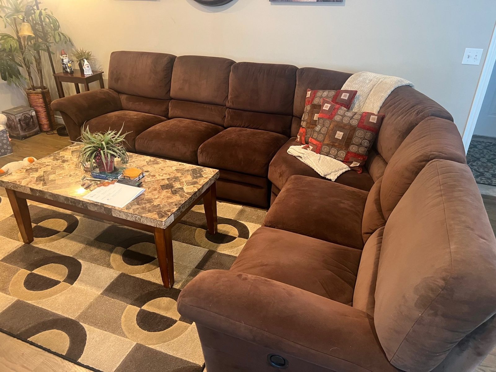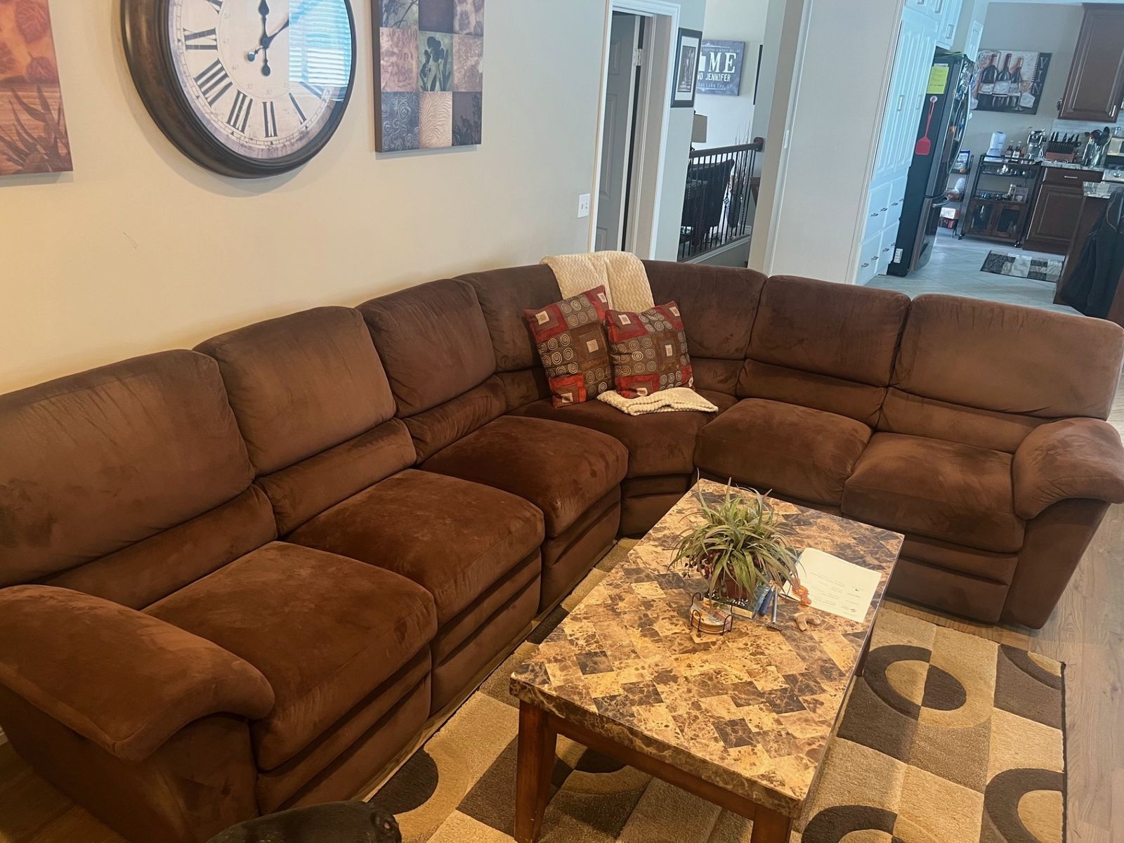 VenmoLarge 6 piece double reclining (both ends) sectional sofa that also has matching reclining chair. Chocolate brown microfiber, very nice condition, used but still has plenty of life left. Approx 120”X96” and 38” high.. recliner chair approx 44X36 . Pickup only and must bring helpto load. Cash or Venmo.
