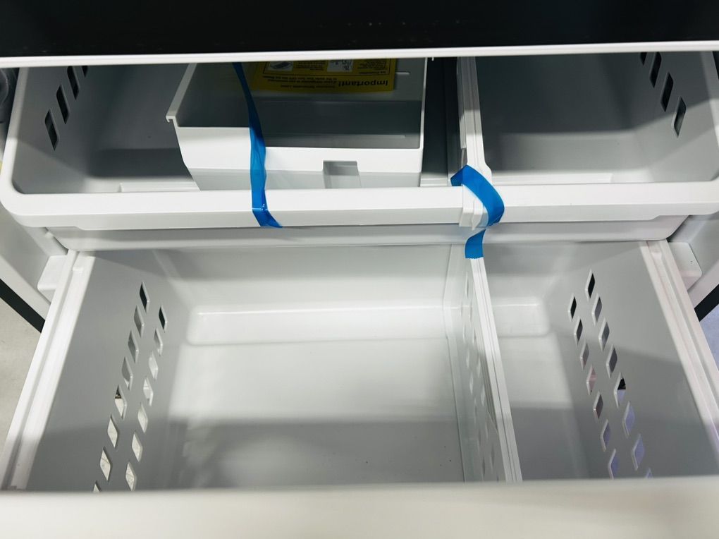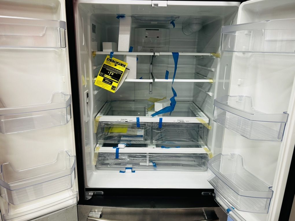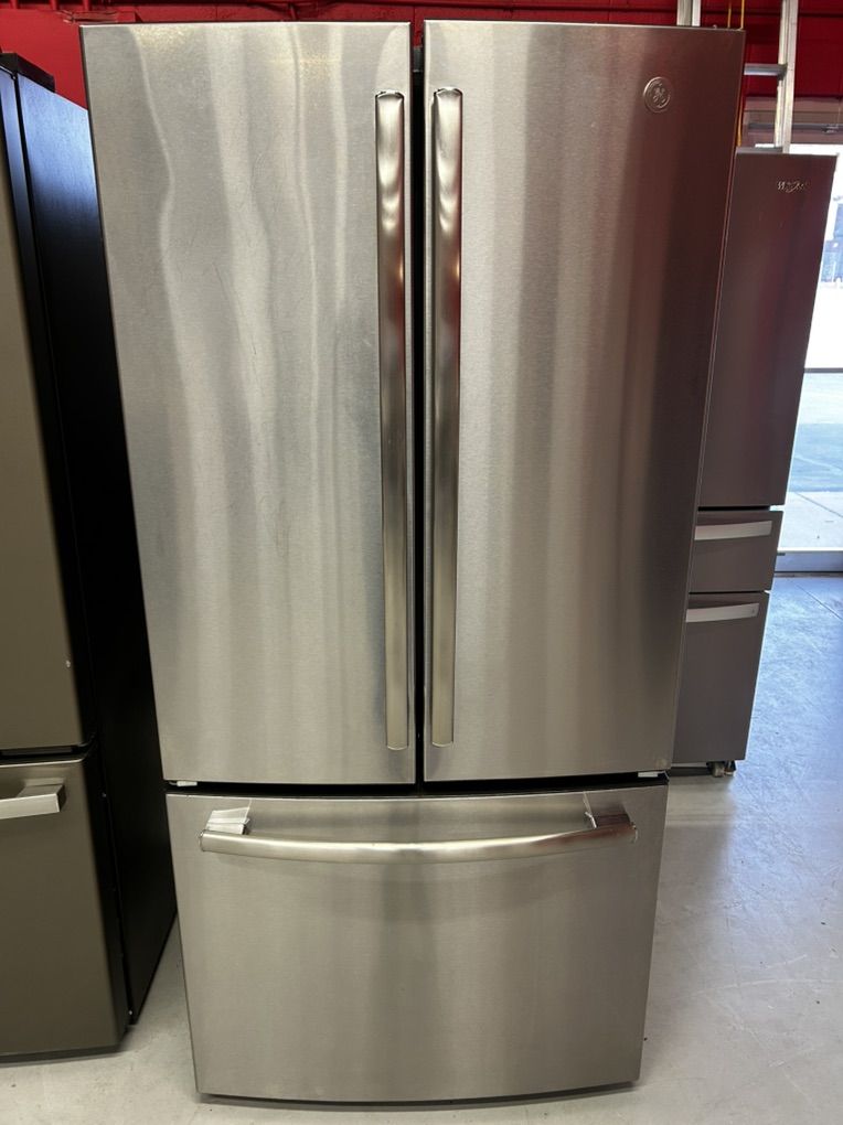 Ge stainless steel french door refrigerator with water and ice maker 24.8 cu ft adjustable spill proof glass shelves crispers large pantry drawer gallon size door bins etc..45 day warranty, delivery/installation available. W 33” D 33 3/8” H 68 1/2”