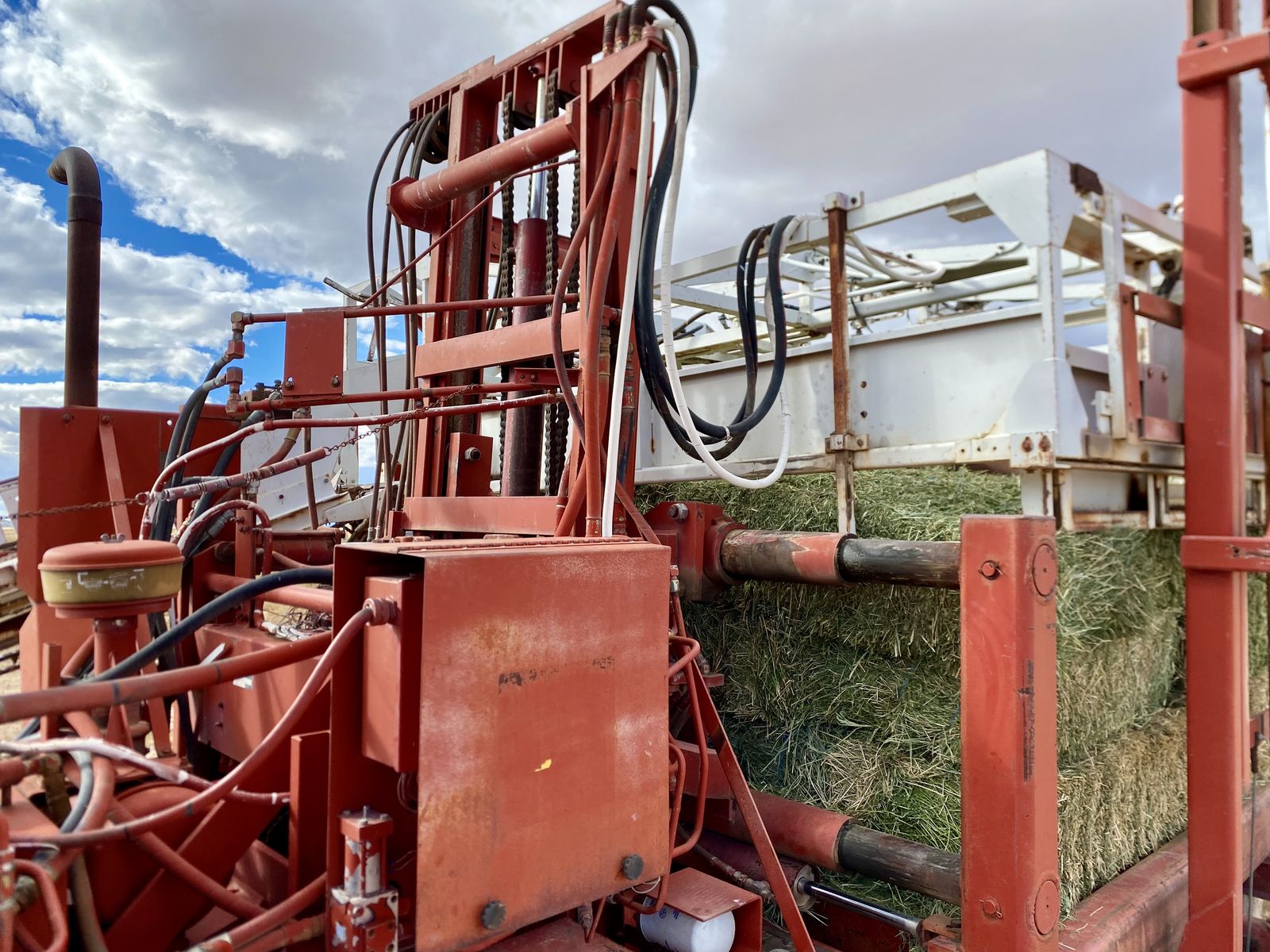 This machine picks up 56 3 string bales in a nice square tied stack; then you squeeze it all off with the same machine. It can lift high enough to double stack.