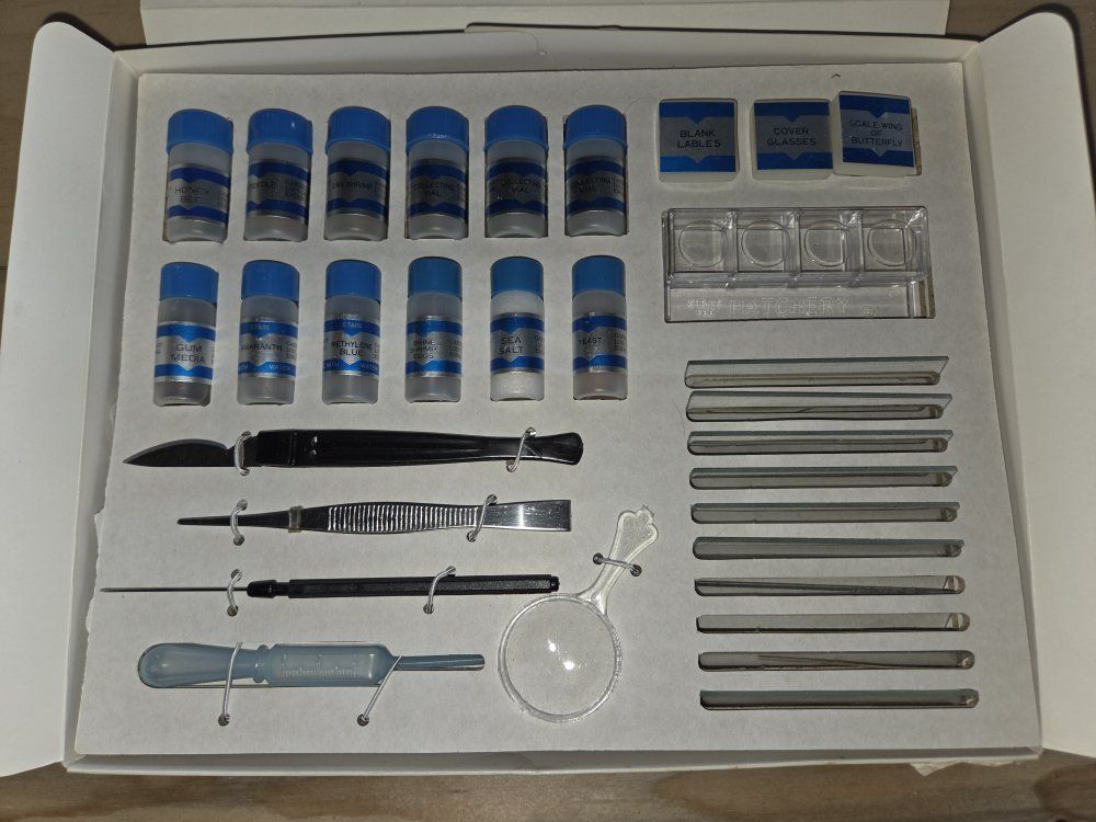 Includes parts such as a Magnifier, scalpel, tweezers, and pipettes for scientific experiments.