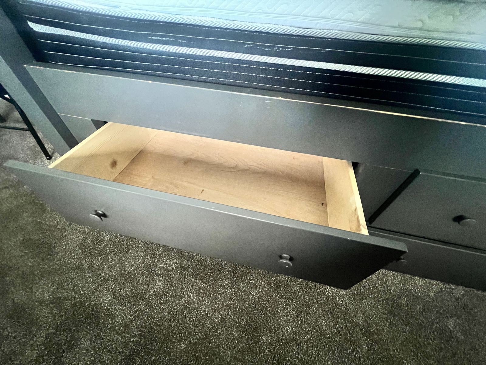 VenmoI have two (possibly 3) dark gray twin captain beds for sell. They were custom made with solid wood. My children are flying the coop 🥹 so we’re moving things around. This picture shows the bed double-stacked with mattresses for storage. The mattress doesn’t really sit that high. We can possibly deliver in Cache Valley for an extra fee.