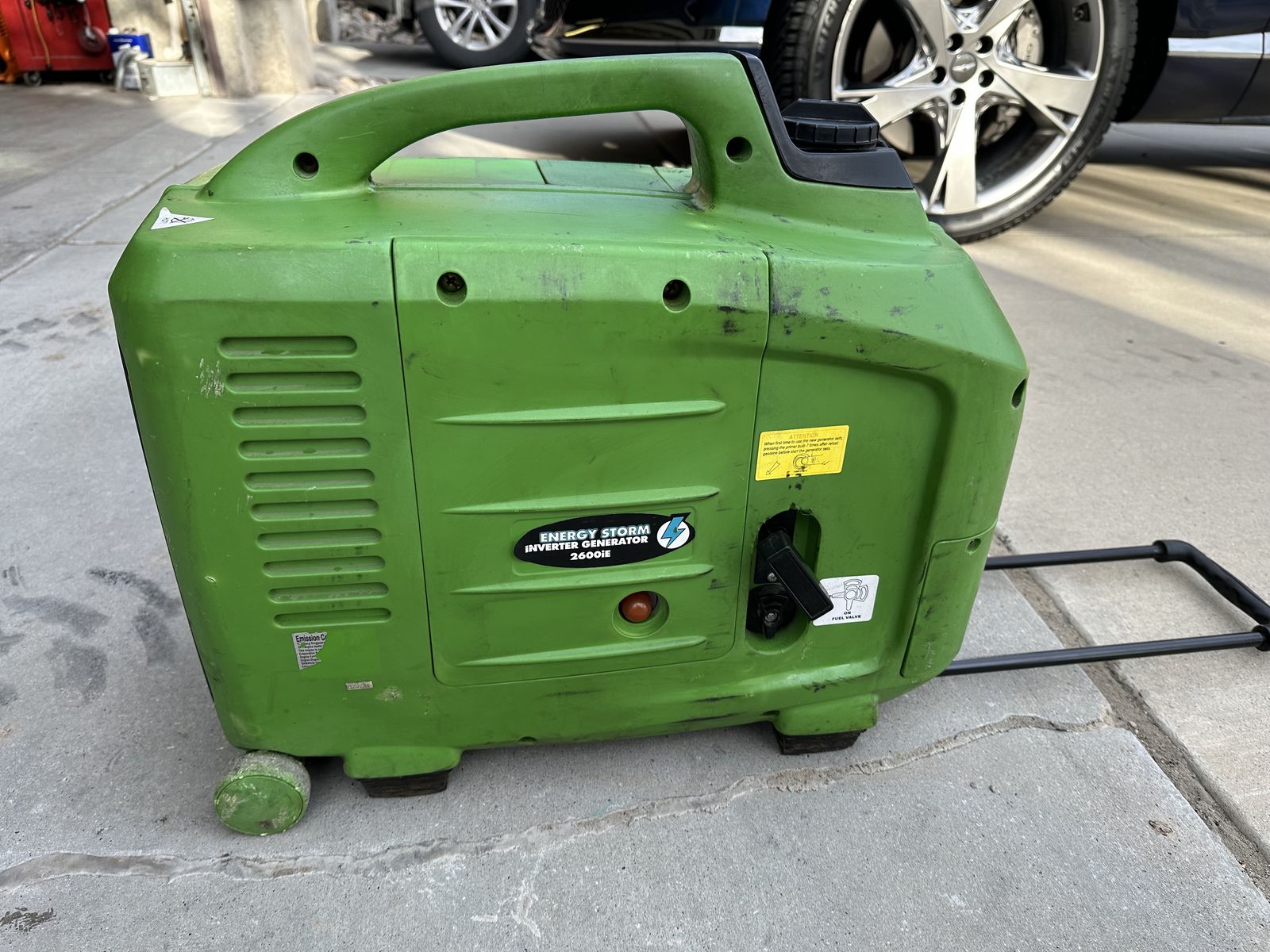 VenmoEnergy Storm ESI 2600iER Inverter Generator – Runs Great with Pull Start! Up for grabs is this solid Energy Storm ESI 2600iER portable inverter generator. It’s a reliable 2600 running watt / 2800 peak watt unit (150cc 4-stroke OHV engine) with clean, pure sine wave power – perfect for sensitive electronics, camping, tailgating, home backup, or job sites. Key features: • Electric start with remote key fob capability (but battery is weak/bad – it tries but doesn’t have enough juice to crank). • Reliable pull start – fires right up every time, no issues! • Quiet operation, eco mode for fuel savings, parallel capable for more power. • Outlets: 120V AC (including 20A), plus low oil shutoff and overload protection. • Wheels and handle for easy transport. It’s in good cosmetic shape with some normal wear (see pics – green suitcase-style design). Starts and runs strong on recoil – just needs a new battery (cheap and easy fix, like a small 12V motorcycle battery) to restore electric/remote start.