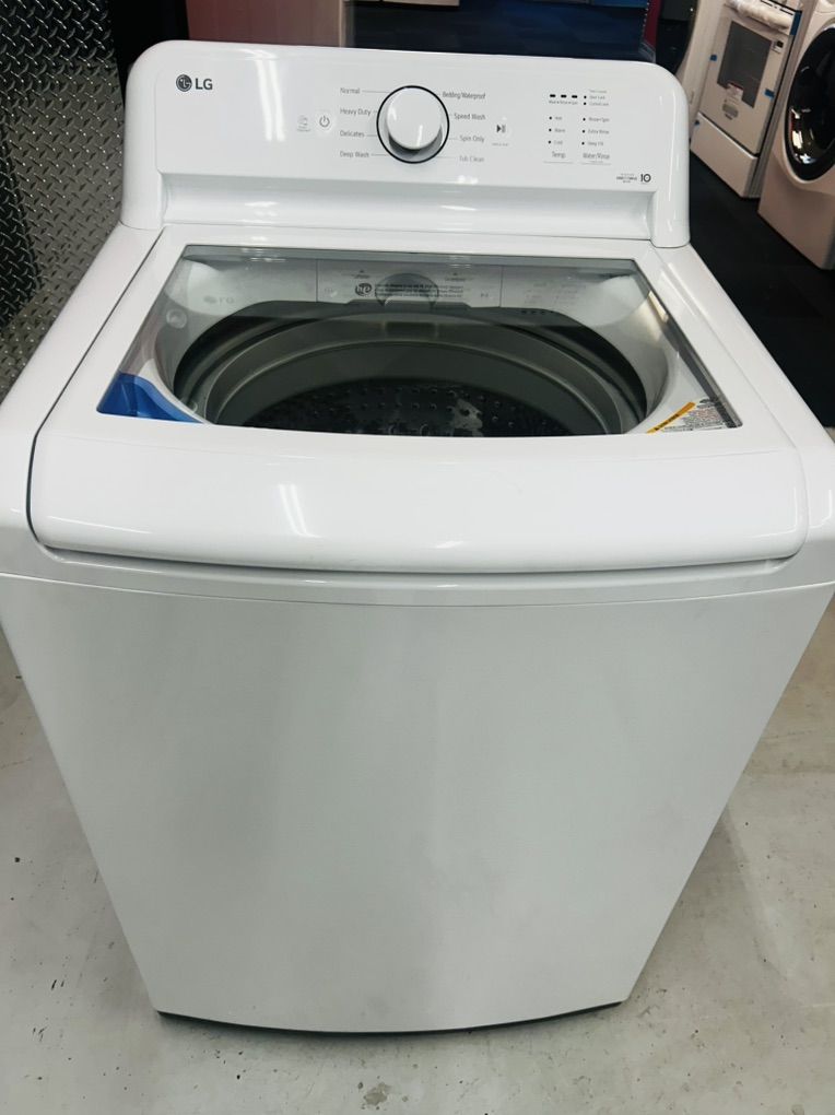 LG washer 4.1 cu. ft. top-load washer stainless steel drum featuring a 4-way agitator, TurboDrum technology for powerful cleaning, and a soft-closing SlamProof glass lid. It includes 8 wash cycles (e.g., Heavy Duty, Bedding, Tub Clean) and 4 options, including a Deep Fill feature for extra water. Brand New Open Box. 45 day warranty, delivery/installation available.