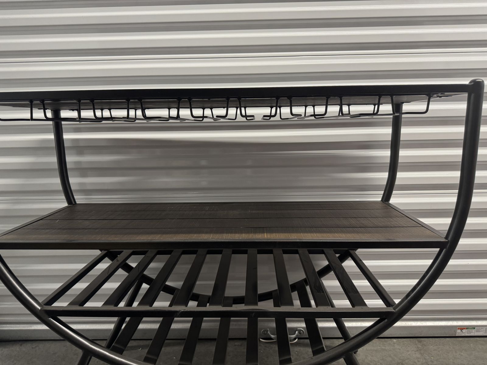 Features: Built-in wine glass holder under the top shelf Slatted middle shelf for wine bottles Bottom shelf for additional bottle storage Durable metal frame with rustic wood shelves Compact size but holds multiple bottles and glasses