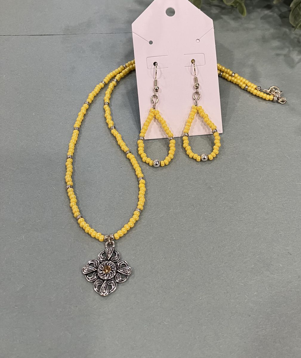 VenmoVibrant 18 inch long yellow necklace made small beads and a silver colored, flower pendant, with a yellow rhinestone at its center and matching yellow tear drop earrings. Earrings are 1.5 inches long with silver plated ear-wires. Gift box included. Local meetup or can mail with ship fee.