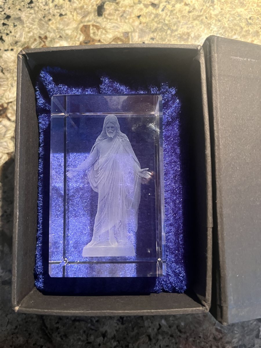VenmoThis is really beautiful! The rotating base turns and it changes colors as it turns. The crystal cube has a laser engraved Christus inside it. The cube also has belveled sides for added elegance. When you put the crystal Christus on the rotating base it is beautiful! Add a touch of peace and beauty to your home with this. This would be a great gift. Price is firm.