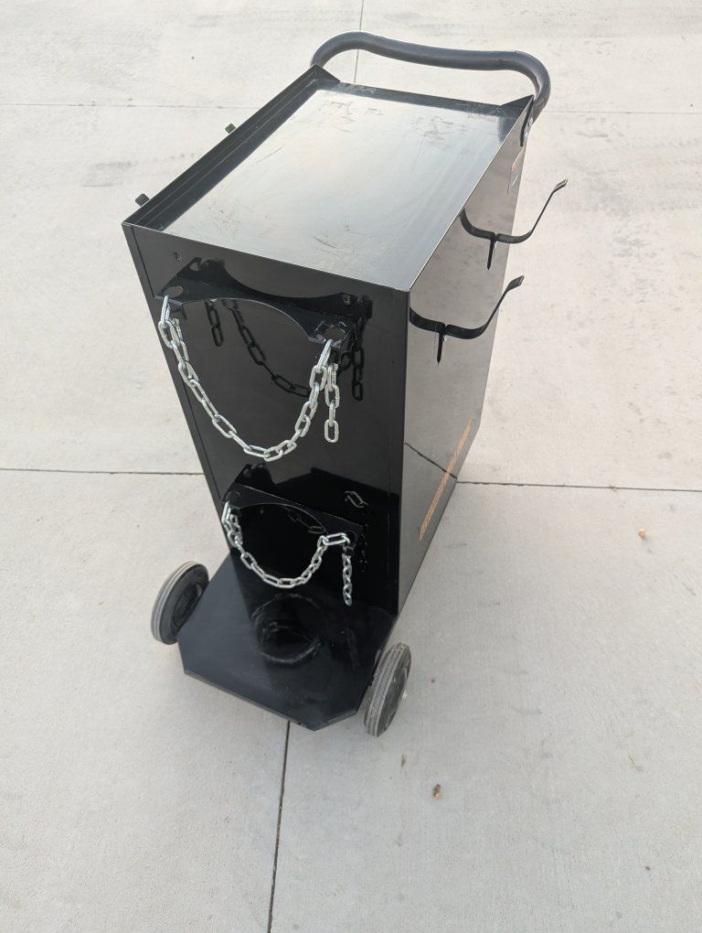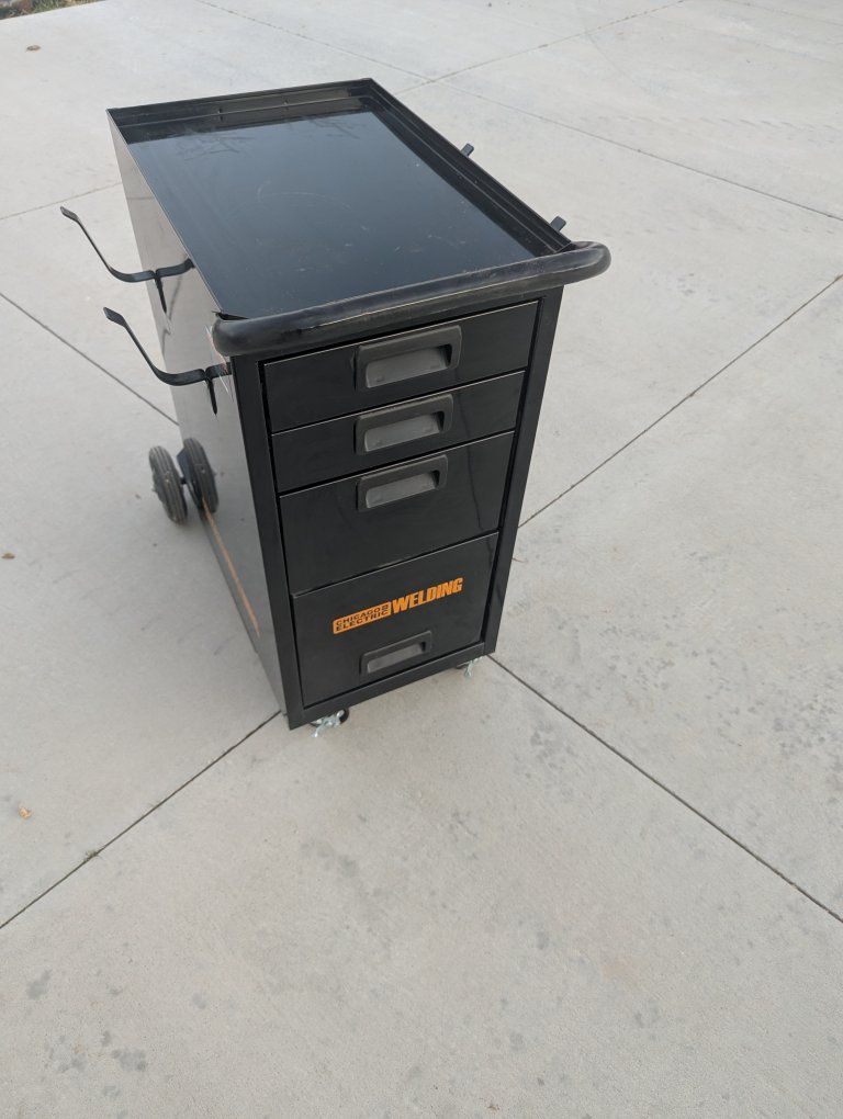 Used but in good condition welding cart. Bottle holder, 3 drawers and one cabinet. It has enough room for all your basic equipment plus a welder on top.