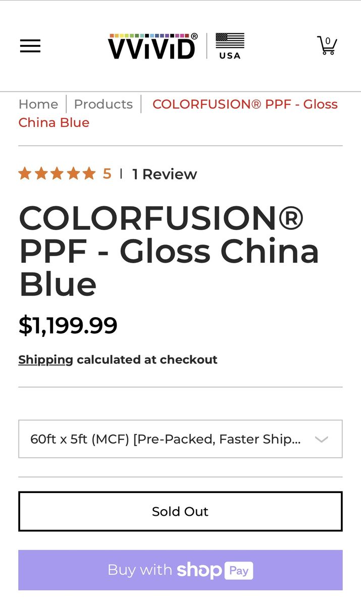 Brand new roll of China blue color fusion PPF. 60 ft x 5ft. Retail price is $1200 and currently out of stock through Vvivid