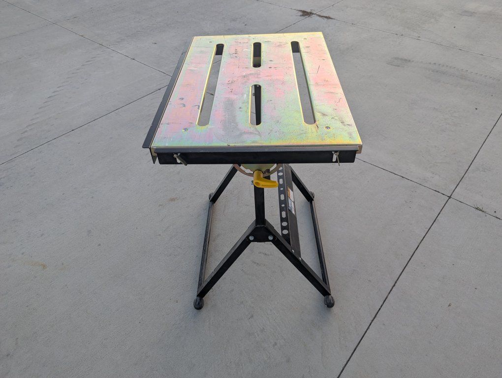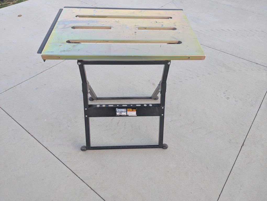 Collapsible welding table. 20" x 30" top and 33" tall. It has slots in the top for clamps and edges that come up to hold work pieces.