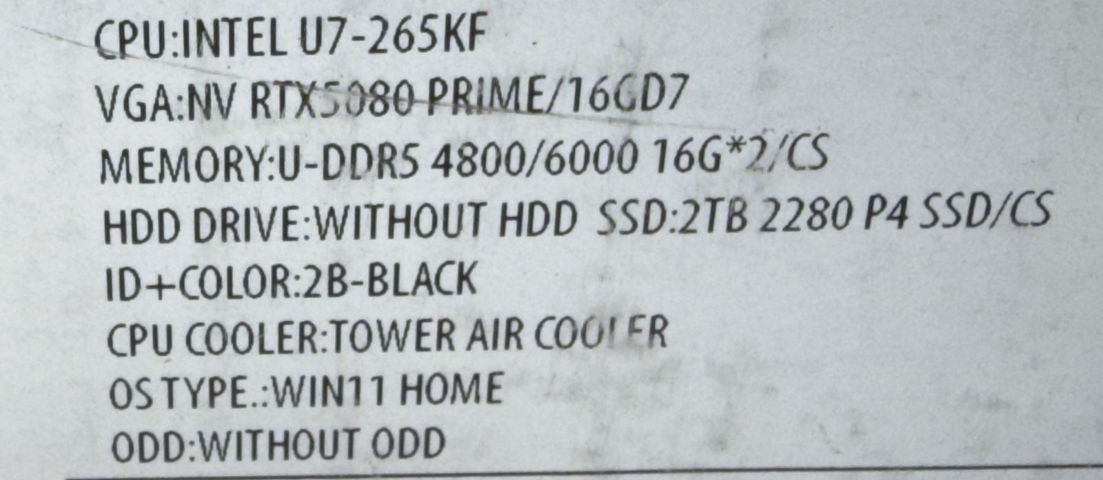 CPU: Intel Core Ultra 7-265KF GPU: NVIDIA GeForce RTX 5080 PRIME (16GB GDDR7 VRAM, Next-gen flagship) RAM: 32GB (16GB x 2) DDR5 6000MHz Dual-Channel High-Speed Memory Storage: 2TB NVMe PCle 4.0 SSD Cooling: Tower Air Cooler OS: Windows 11 Home Color: 2B-Black