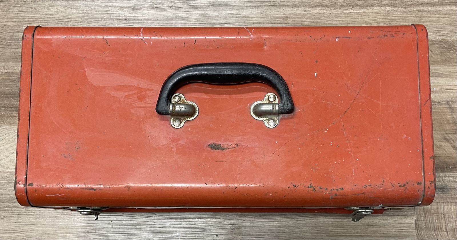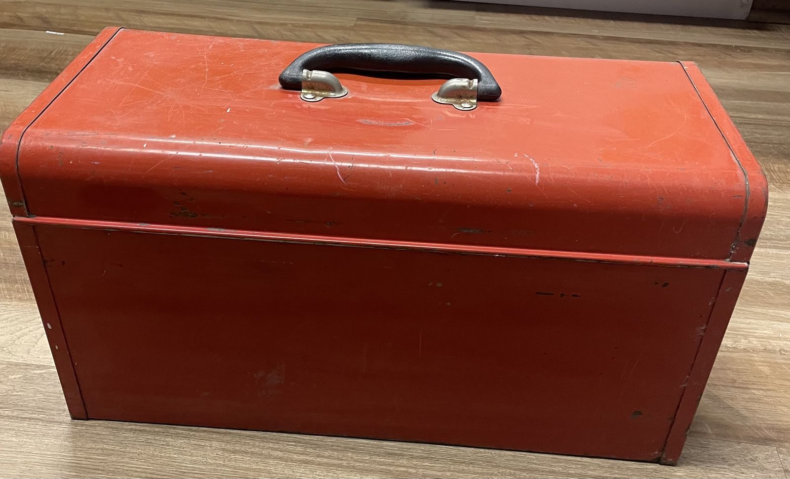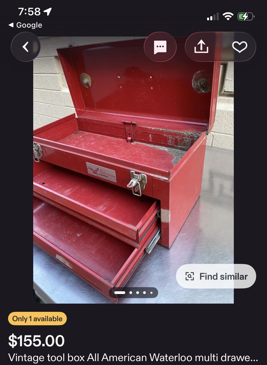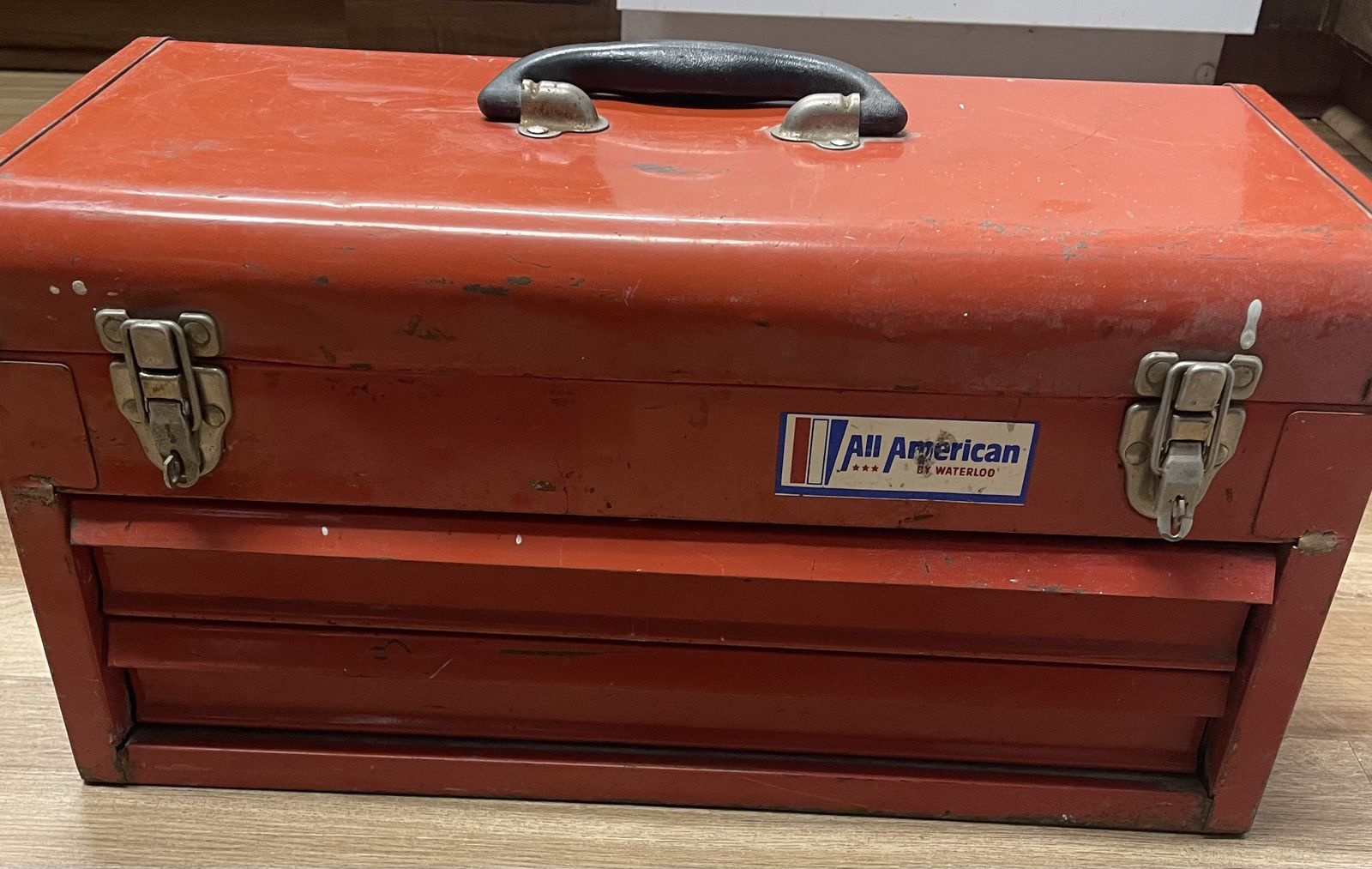 VenmoVintage All-American by Waterloo steel toolbox, likely from the 1980s, featuring a red metal finish with two or three drawers and a hinged lid. • Brand/Maker: Waterloo Industries, branded as All American • Material: Steel construction. • Features: Portable design with a carrying handle, locking latches, and multi-drawer storage. • Dimensions: Typically measures approximately 20.5 × 12 × 8.5.