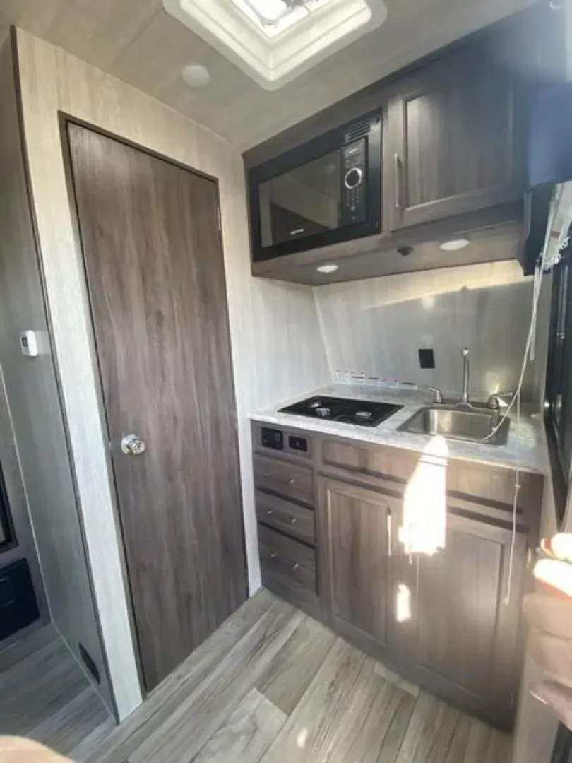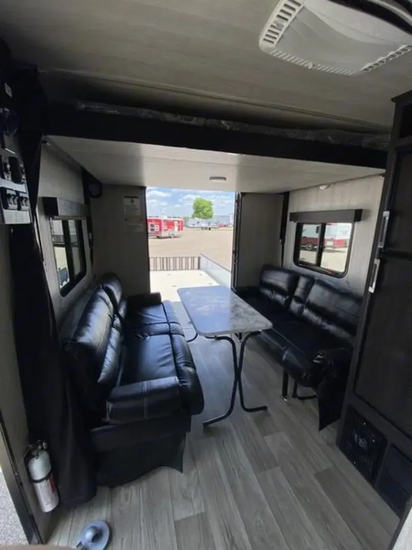 The Genesis Supreme Overnighter 12-14.6FK is a 31'6" travel trailer toy hauler featuring 14'6" of cargo space, a front kitchen (FK), and a 8,200 lbs GVWR. It is designed for off-road use with dual 4,400 lb axles, 15" tires, and 50 gallons of fresh water. Key features include a HappiJac electric queen bed, dual sofas, and a full bathroom. Year 2022. Has solar
