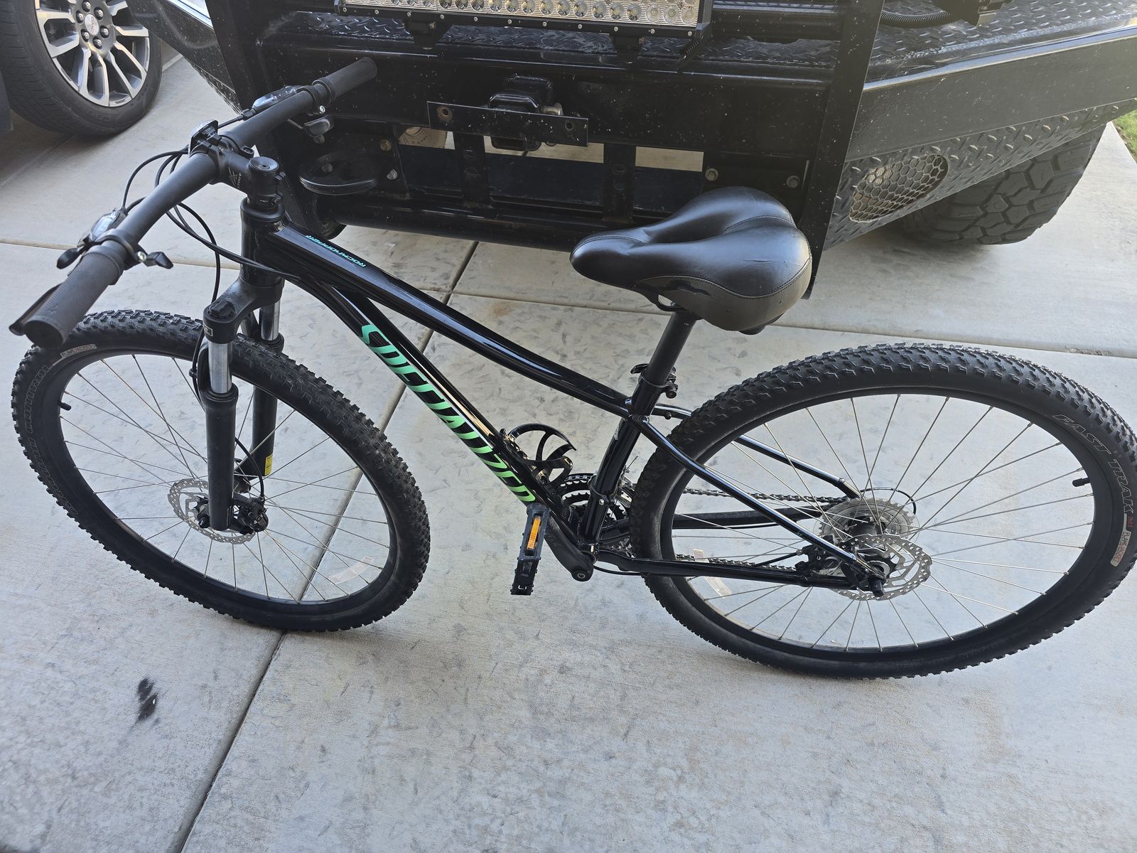 The all black bike is a size L Specialized Pitch 27.5", used but in good shape. Was $700 new, asking $250.