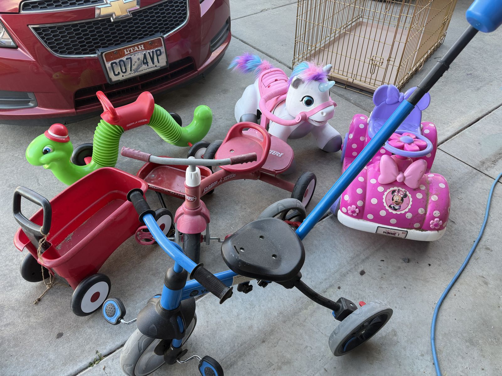 VenmoRide on motorized unicorn- $15 Ride on Minnie Mouse car- $10 Blue trike- $15 Radio flyer plastic trike- $10 Radio flyer wagon- $10 Small radio flyer wagon- $5 Ride on caterpillar- only used inside $20