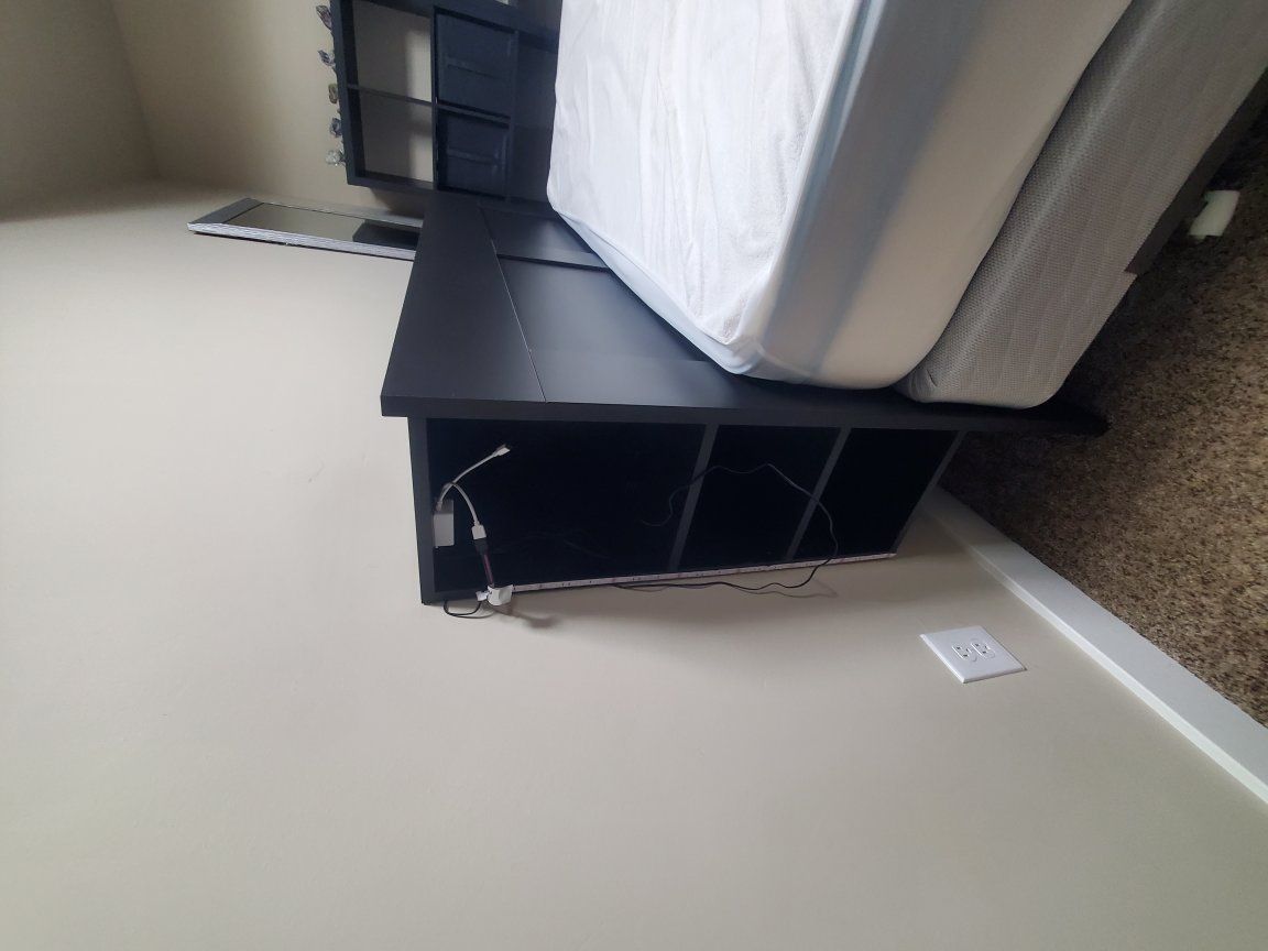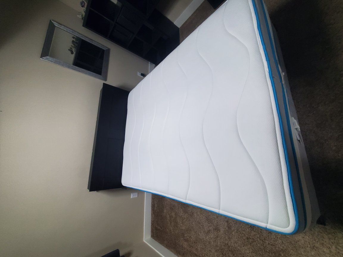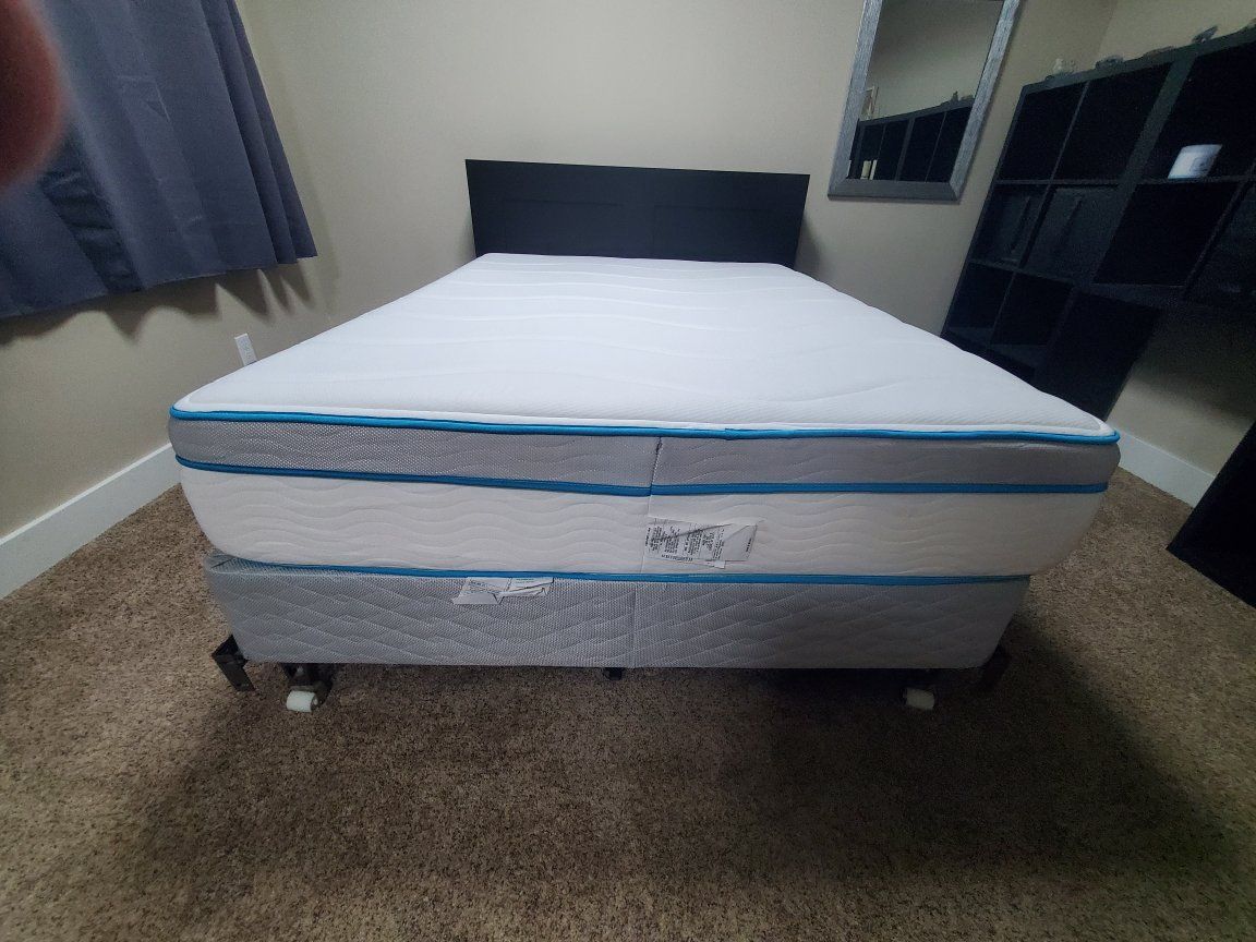 Queen size mattress with box spring and bed frame. Includes headboard with built-in storage shelves on the sides.