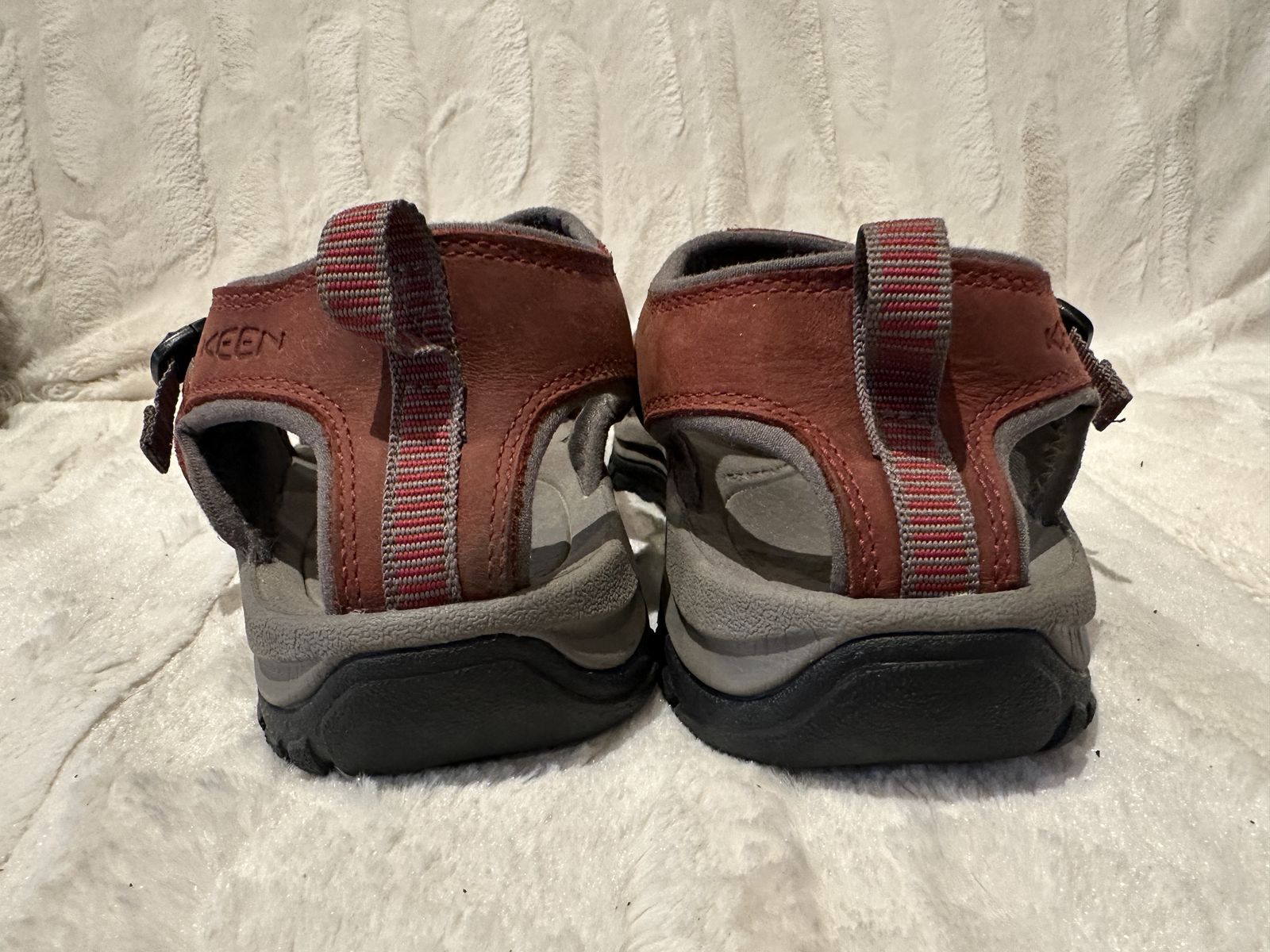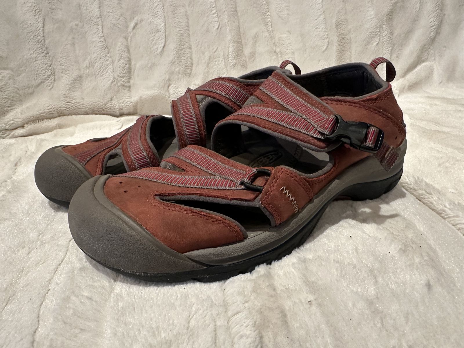 Keen women’s size 9.5 burgundy leather with gray trim, hiking sandals. These are in good condition, see photos for details. I take cash or Venmo, but cash is preferred. Text is best. 801-201-4446. Check out my other ads for additional sizes and styles.