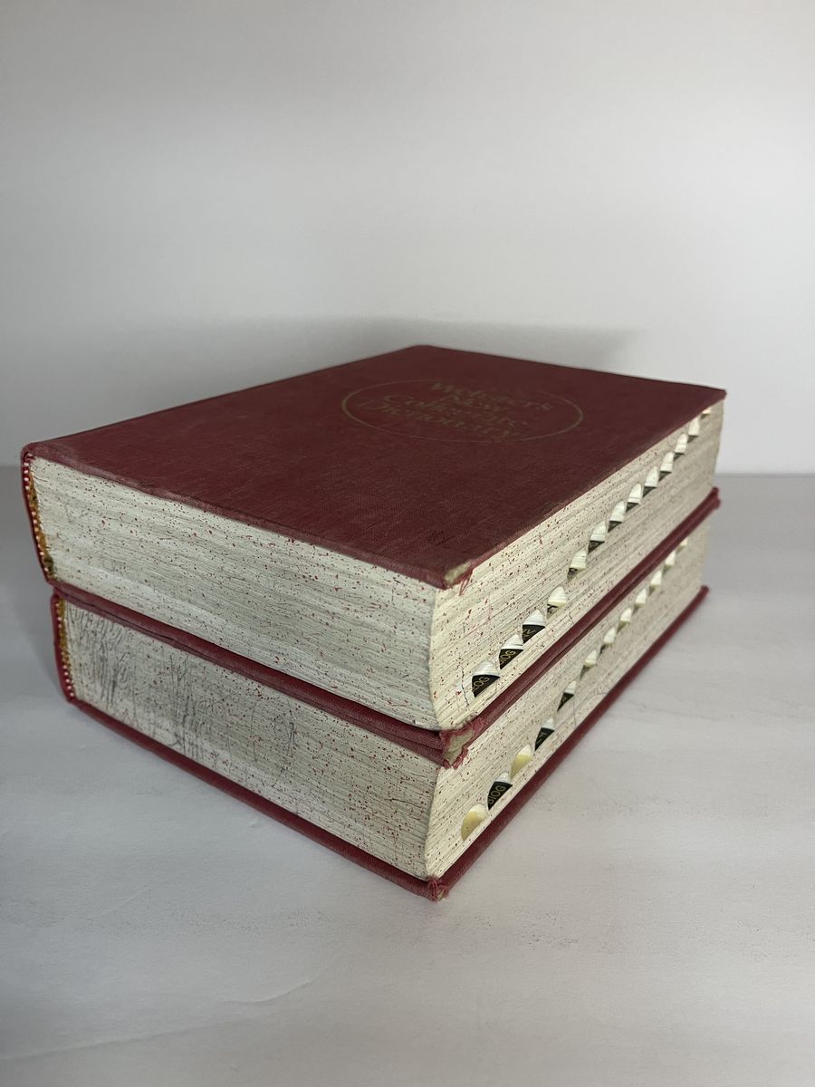 Pair of vintage Webster’s New Collegiate Dictionaries with thumb index tabs.