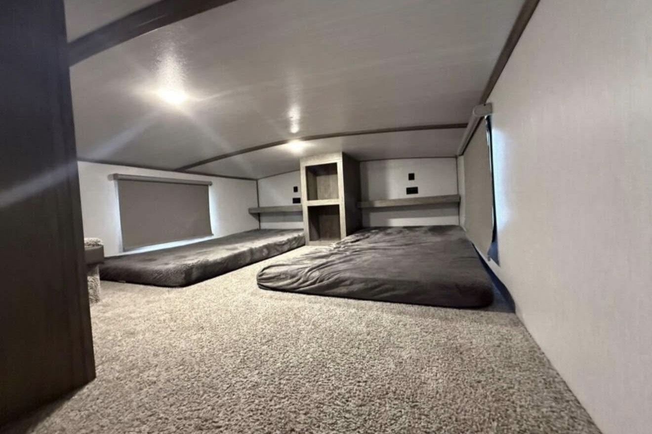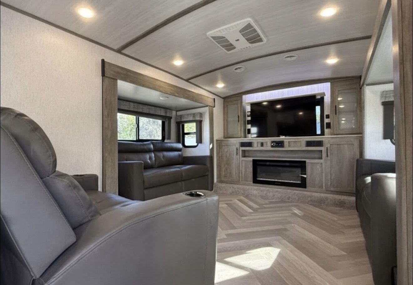Highlights: • Separate front living room with 2 fold-down couches + reclining sofa • Fireplace & large flat-screen TV • Kitchen island with stainless steel sink • Residential refrigerator & 3-burner stove • Walk-in shower • Private master bedroom with king bed & dresser • Washer & dryer hookups • Loft with two twin mattresses • Dual A/C & furnace (no issues) • Auto-leveling system • Outdoor shower • Large exterior storage • Like-new awning with LED lighting • Radio with outdoor speakers • 10-gallon water heater
