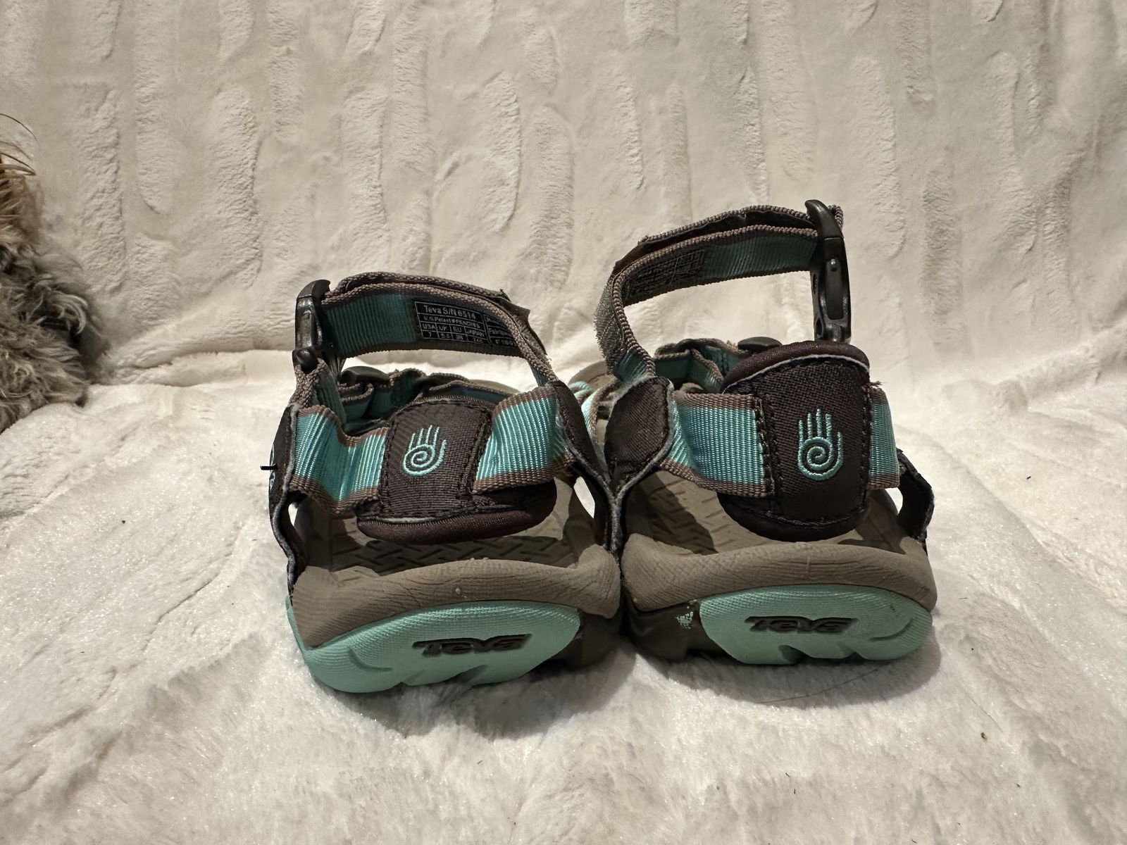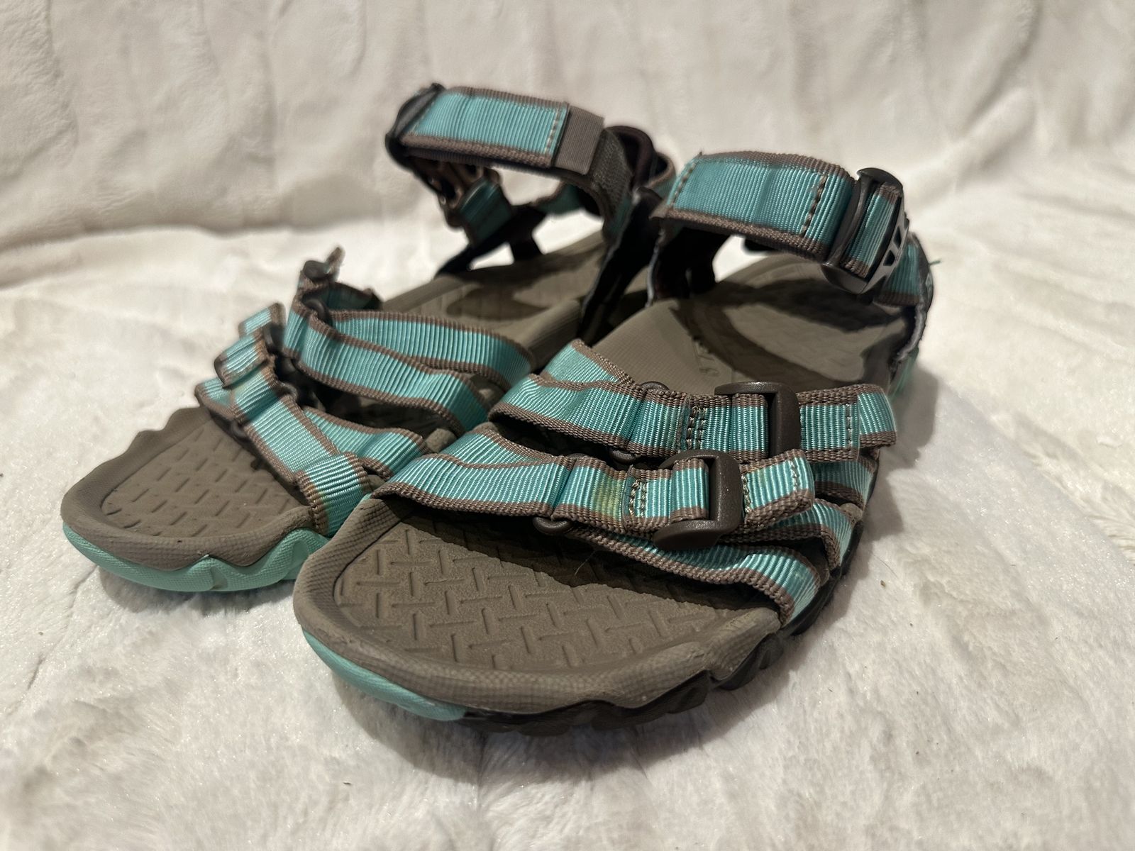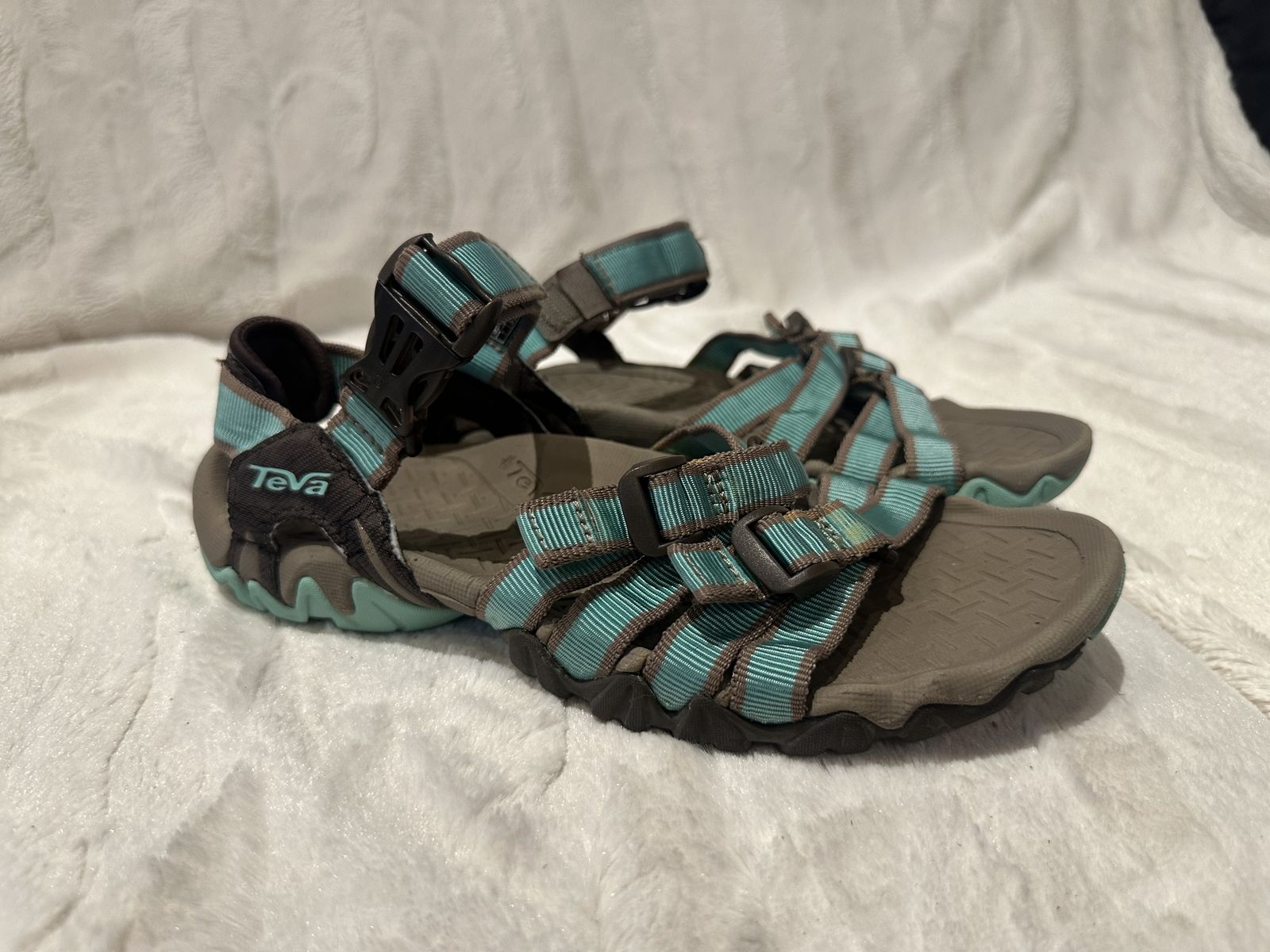Teva women’s size 7 turquoise with brown trim open toed hiking sandals. These are in good condition, see photos for details. I take cash or Venmo, but cash is preferred. Text is best. 801-201-4446. Check out my other ads for additional sizes and styles.