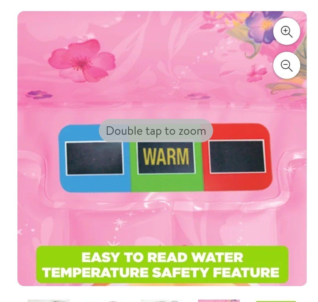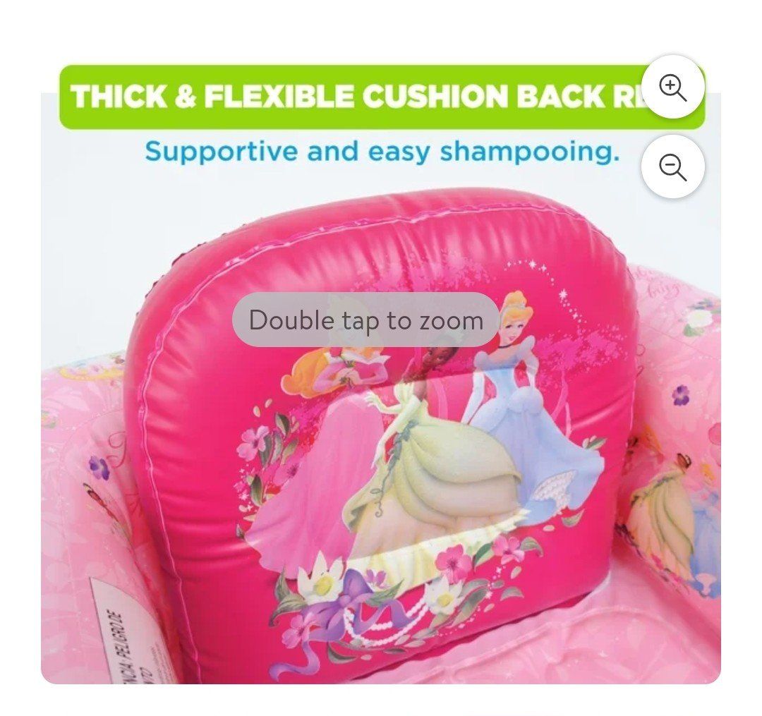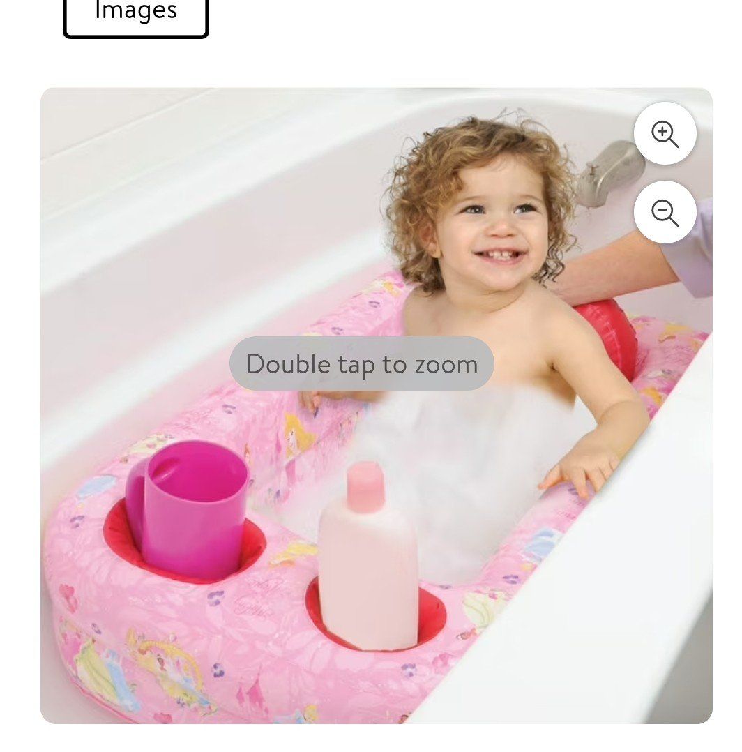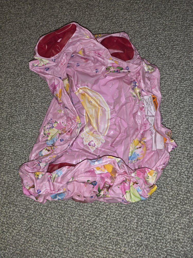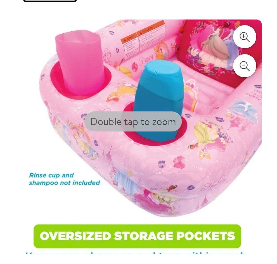 GooglePayComfy Disney Princess inflatable baby bathtub. Pink color with all your fave princesses. Has cushion back support and non-slip ribbed base. Thick padded bumpers for safety. Easy to inflate and has oversized storage pockets. Even has a water temperature display. Measures about 30 in long and 21 in wide. Inner tub is 12 in wide by 15.5 in to back rest.