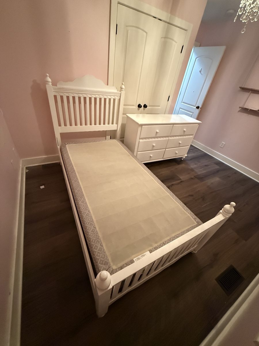 VenmoWhite twin bed frame and dresser set. Only going to sell together. And you can have the box spring if you want too.