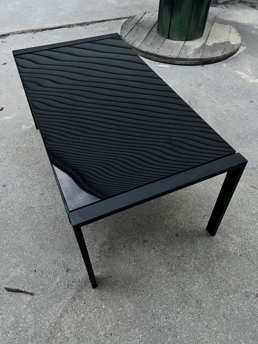ZelleSleek black table. Has a super shiny, glossy top glass, and sturdy black metal frame. Great for indoor or outdoor use.