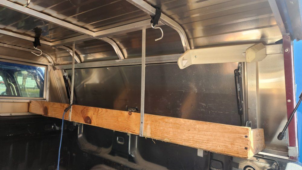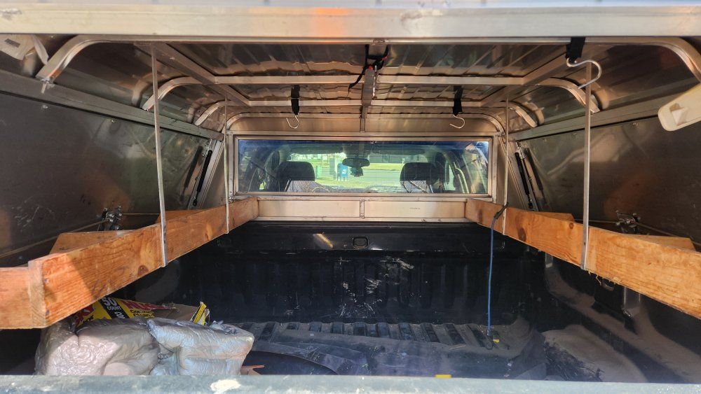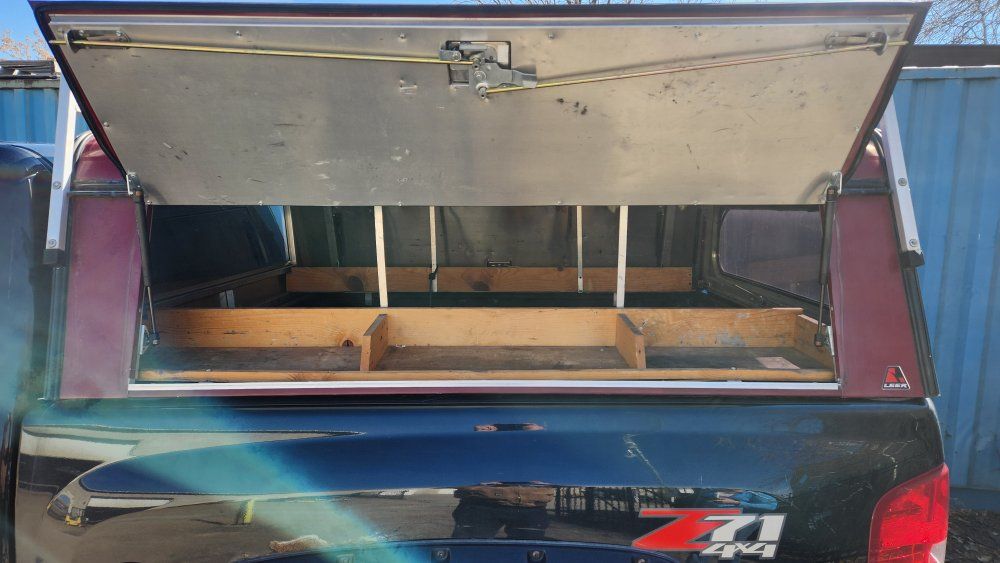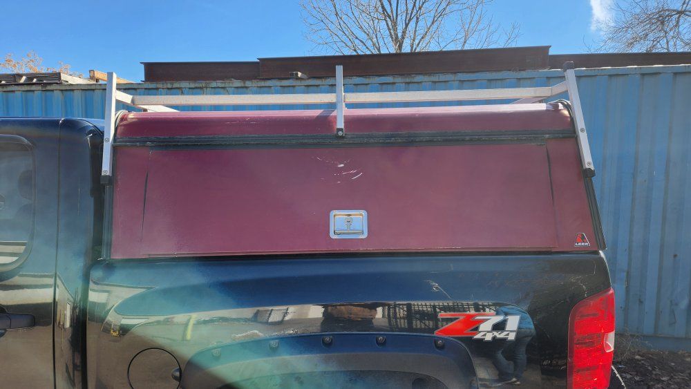 PayPalleer aluminum shell for 6 foot bed, custom shelving for side doors, no leaks, ladder or steel rack on top, all locks work and comes with 2 keys.