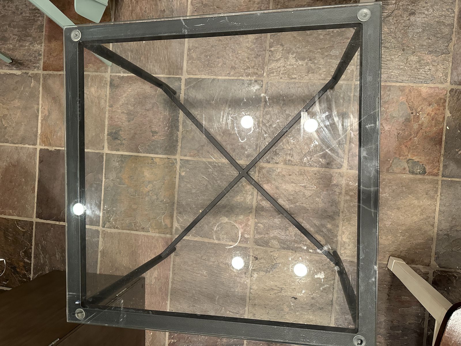 The table is sturdy and lightweight. Glass top is removable for easy cleaning. Shows some normal light scratches on the glass from use but overall in good condition.