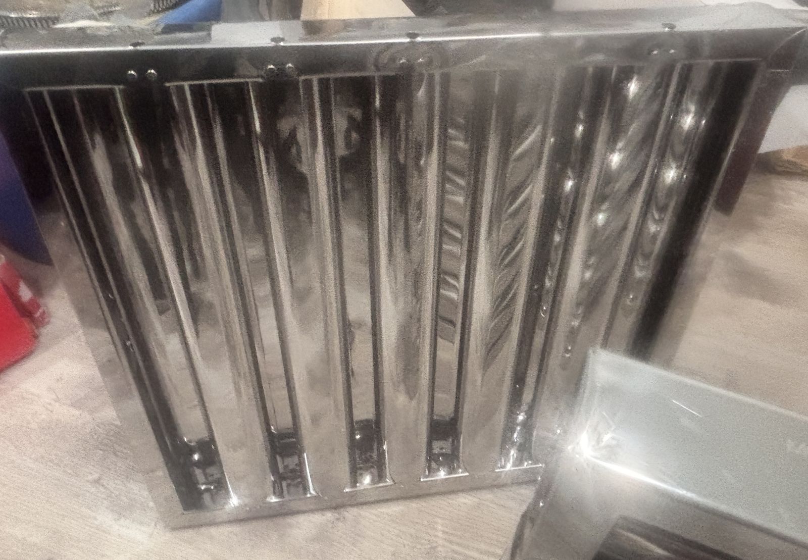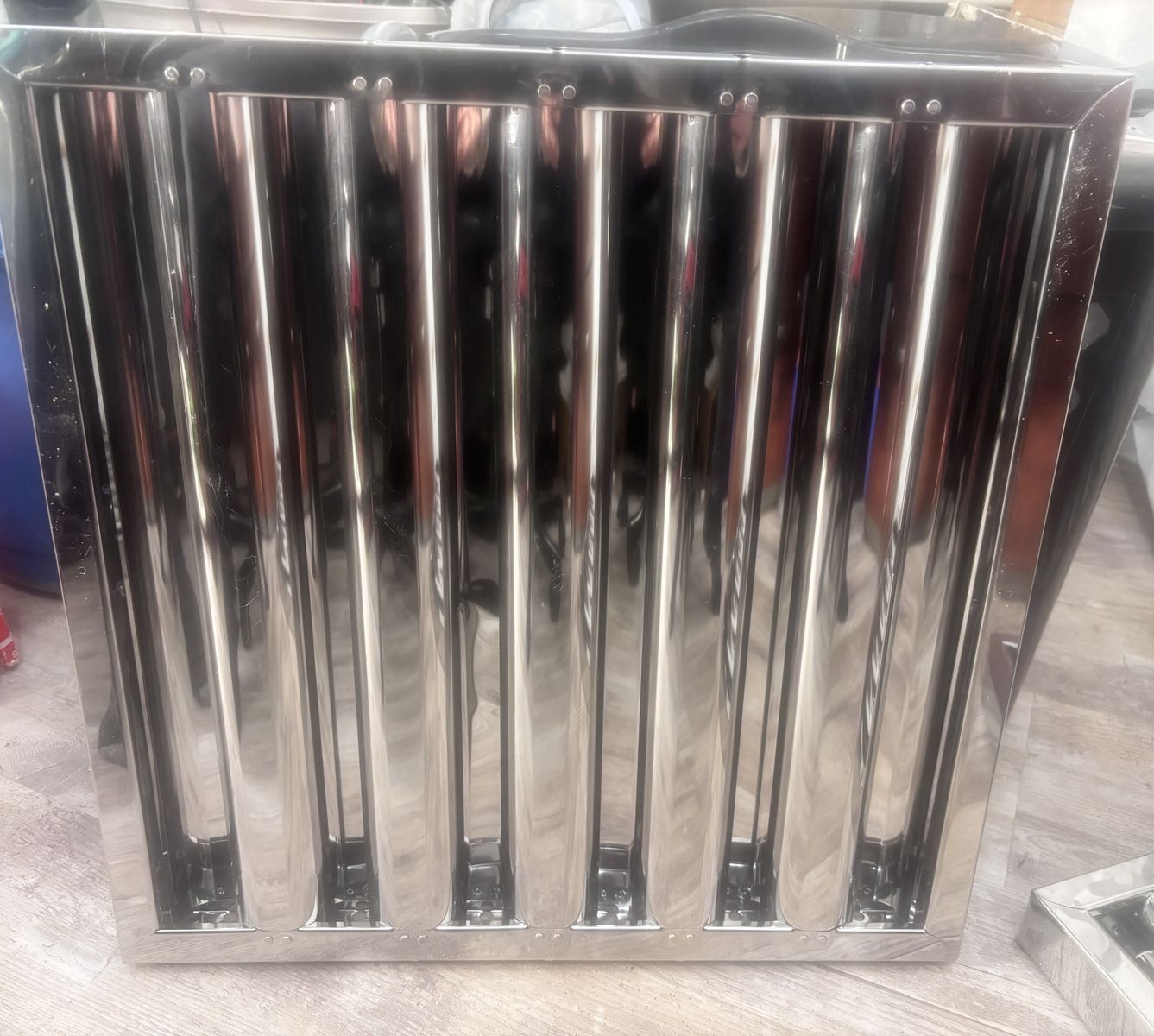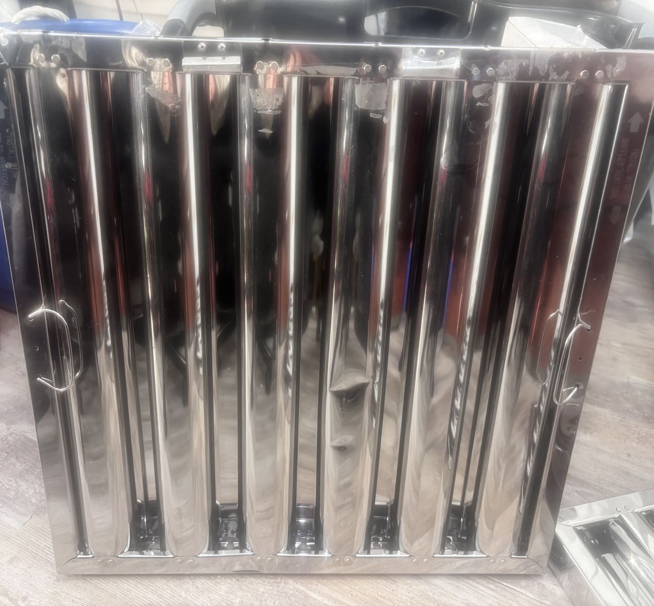 ZellePair of Stainless Steel commercial kitchen hood baffle grease filters, used in exhaust systems. Provides flame protection., Lightweight and easy to clean. New with some small denting. If interested please call or text Jamie at 385-471-4333. Thank you