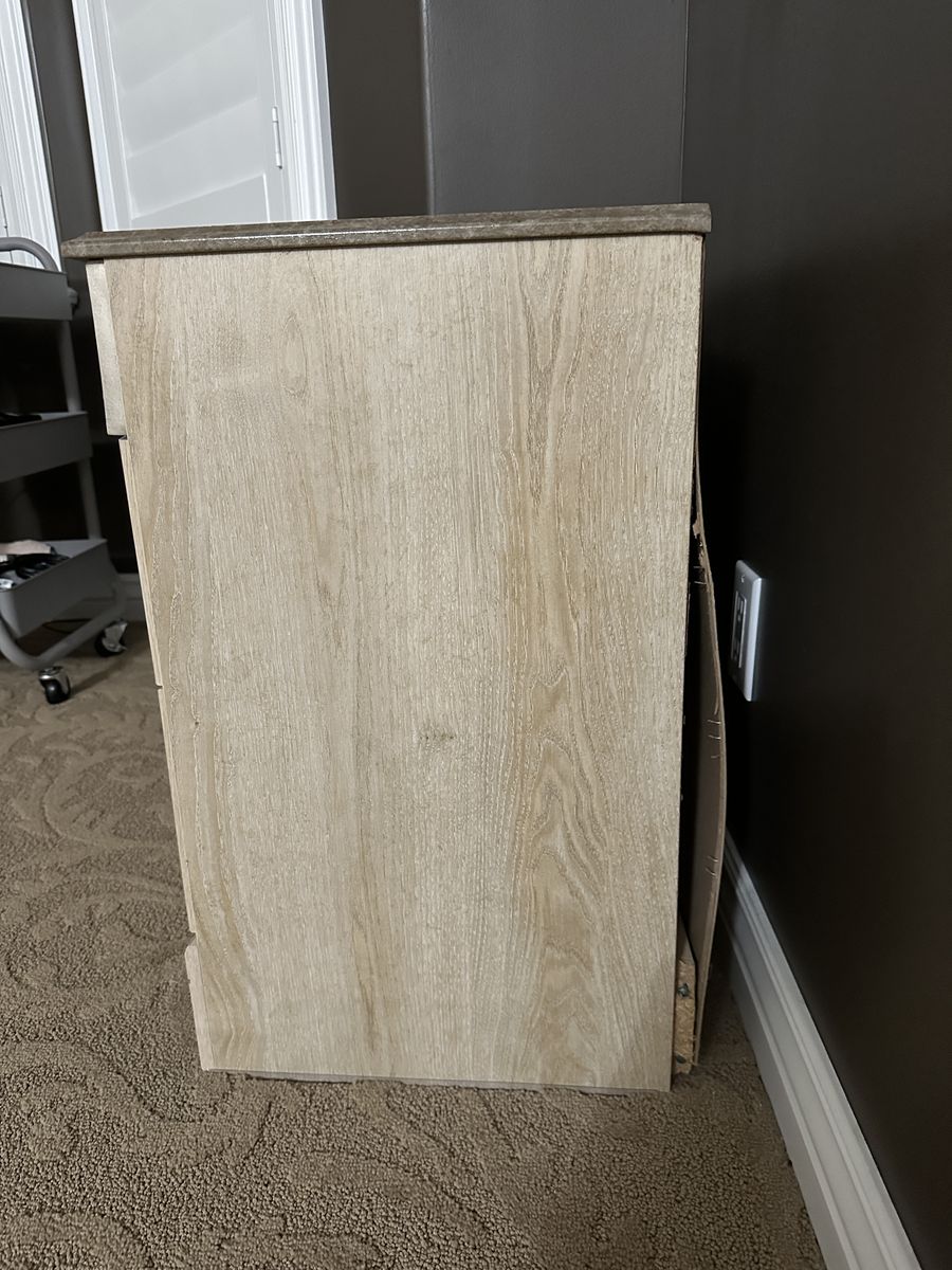 Shows some normal wear from use (see photos), but drawers work well and it’s still solid.