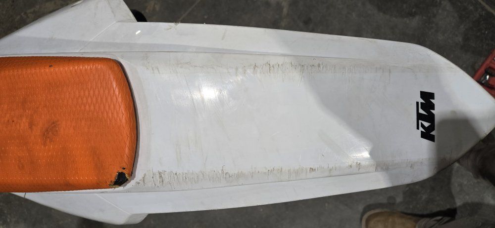 Has a small tear in the back of the seat, and some road rash on the rear fender, both from the same incident when it had less than 10 hrs on it, cosmetic only.
