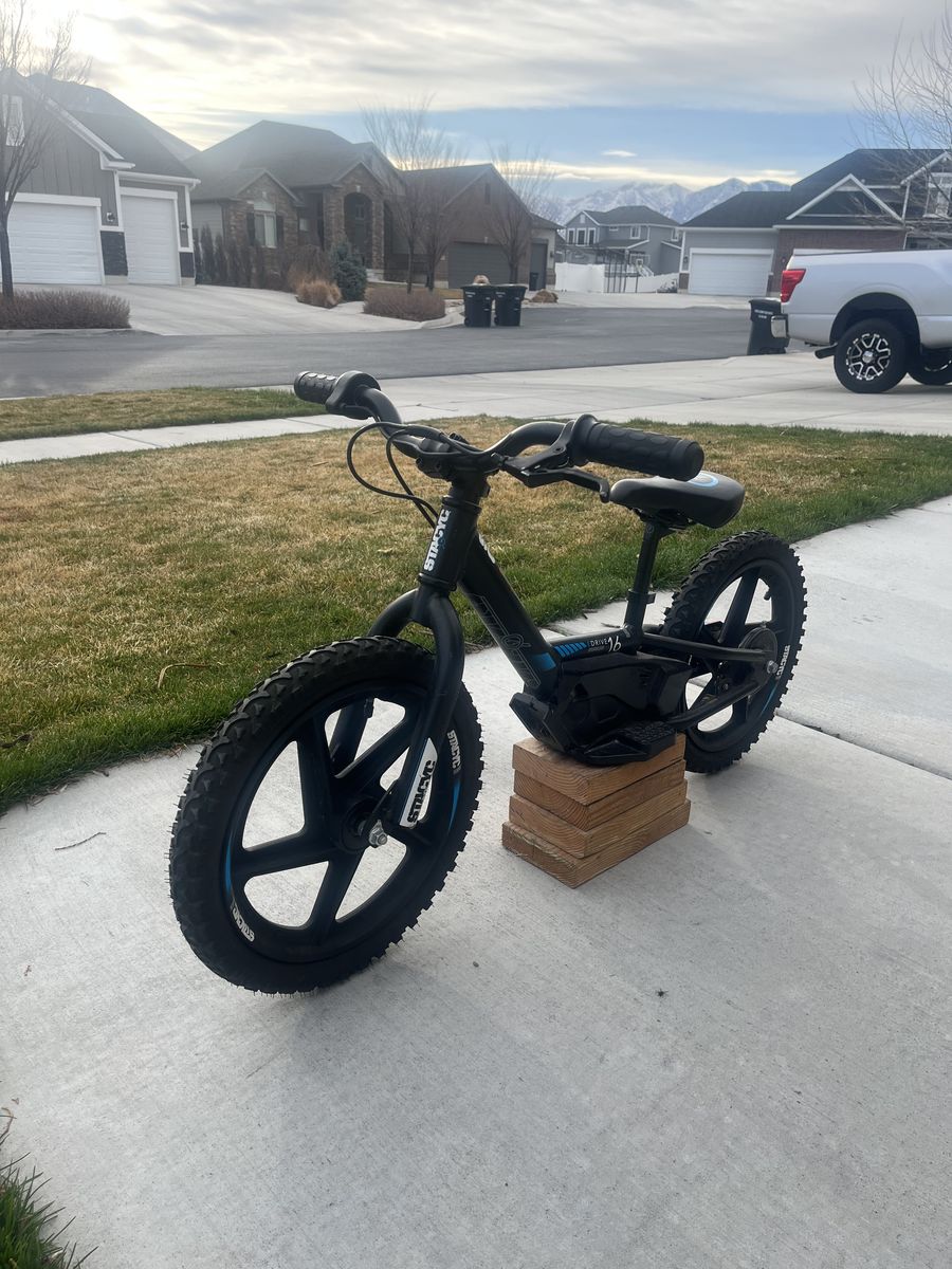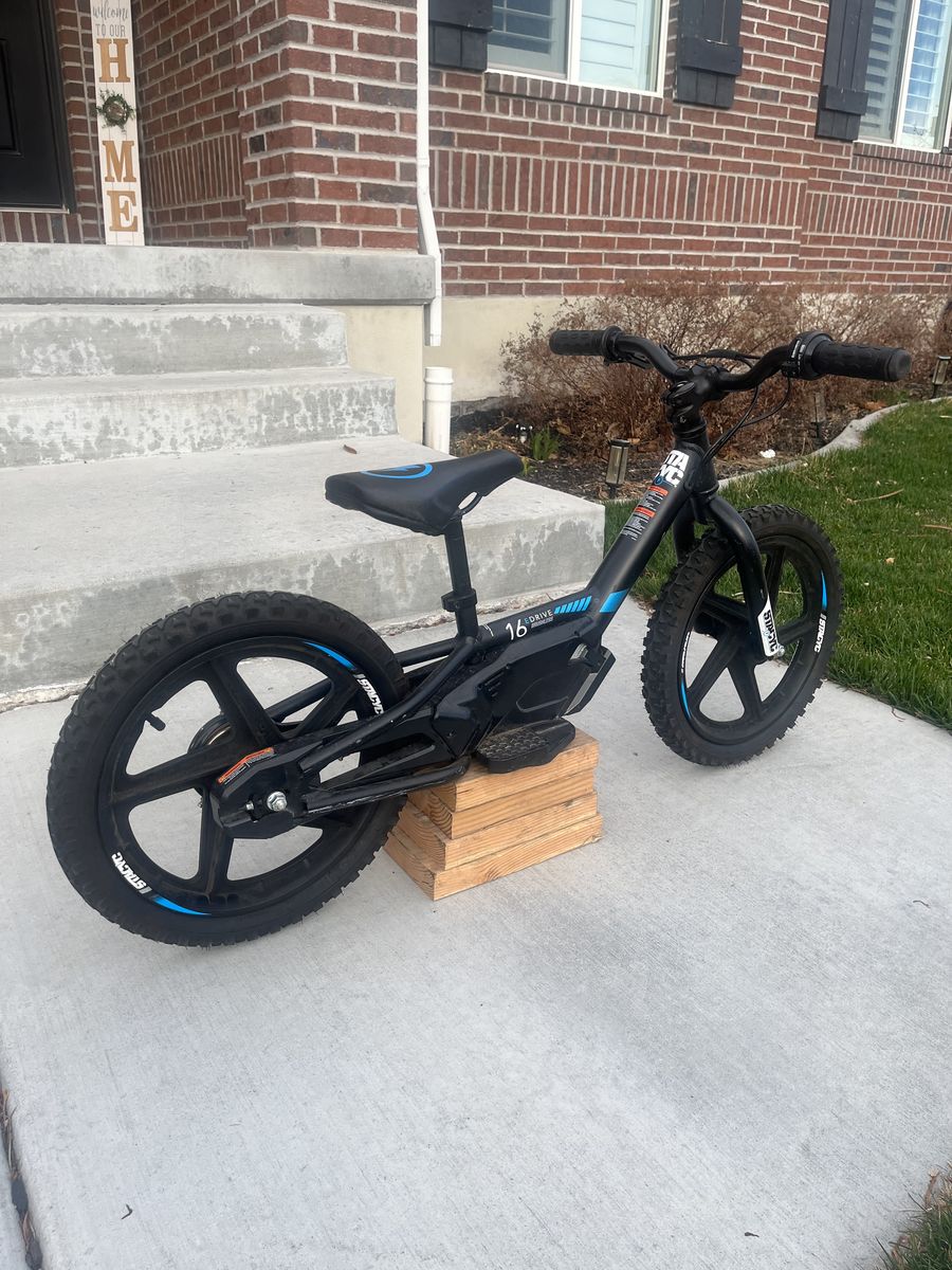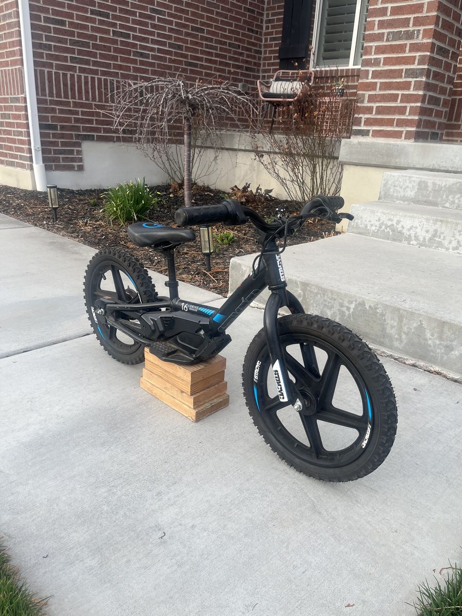 This Stacyc ebike is in excellent condition. It has had very little use. Everything is in perfect working order. It has three speed modes and a twist throttle and is very easy to ride for your little one. It comes with a new battery that has been used once and a charger. I used the Ridgid 18V adapter that will be included with the bike as well. This adapter is a really nice addition since you can use your power tool batteries to power this bike. Call or text with any questions. Thanks for looking and have a great day!