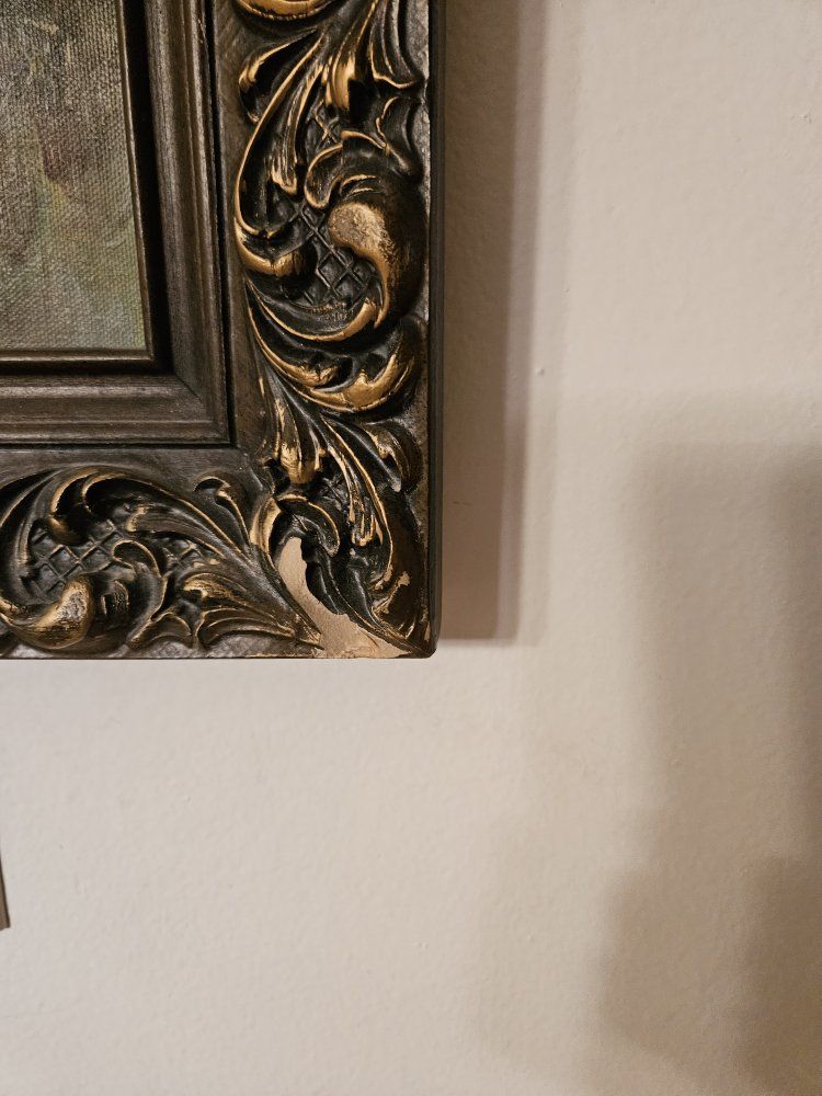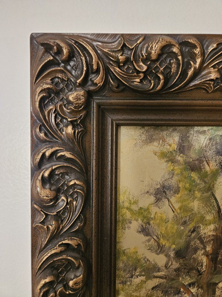 VenmoThis is a beautiful antique oil painting with a decorative wood frame the painting is a landscape. There is a small bit of the frame missing on the lower right hand corner. Because of the pattern of the frame it's not as noticeable. You can see it up close in the last picture. The artist is known for these types of paintings and they sell for $150 - $400. Measurements tall 29", wide 23", deep 2". From a smoke and pet free home. I'm moving from a house to an apartment. Please see my other listings. Thank you!