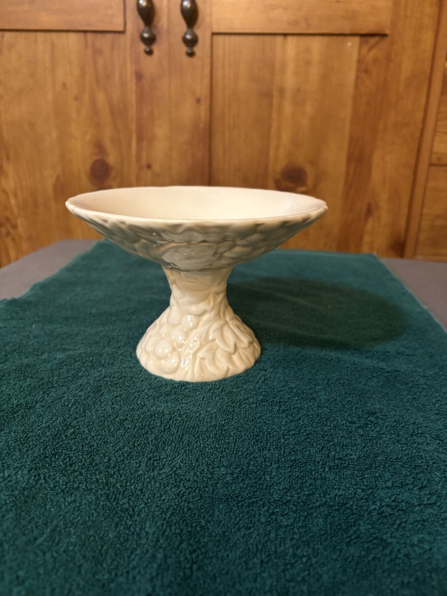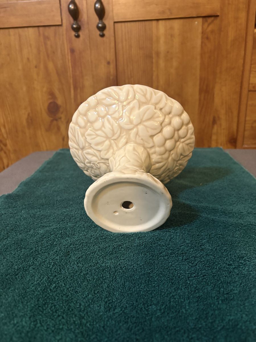 VenmoMetlox Poppytrail Vernon round compote in the Antique Grape White pattern, embossed design of grapes and leaves covering both the pedestal base and the flared bowl. 4 1/4 height 6 5/8 width